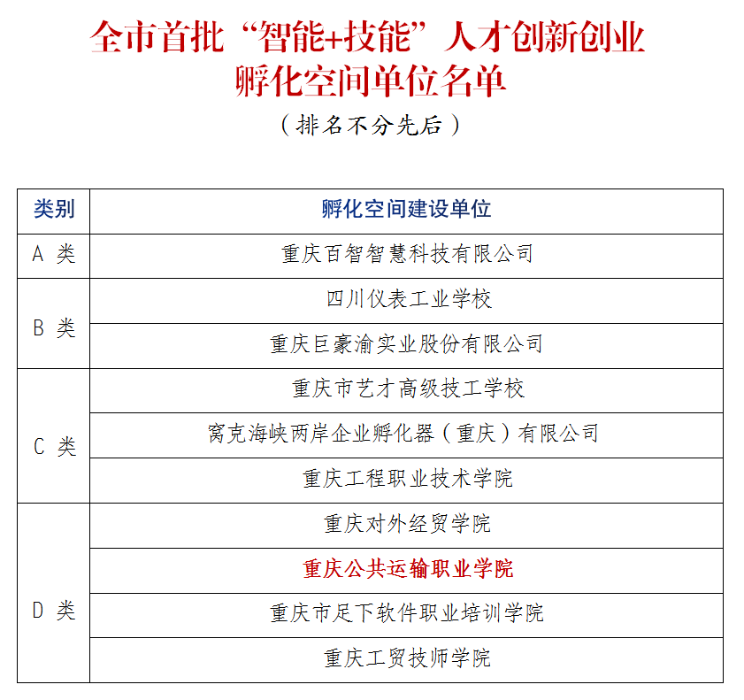 重庆市高技能人才工作联席会办公室近日发出专门通知,公布全市首批“智能+技能”人才创新创业孵化空间名单,重庆交通开投集团所属澳门正规电子游戏平台榜上有名,成为首批10家被认定为“智能+技能”人才创新创业孵化空间之一,也是全市仅有的两所入选该空间的高职院校之一。