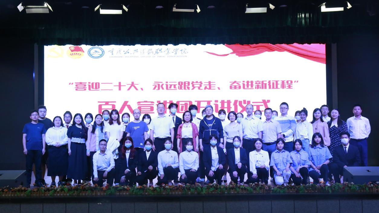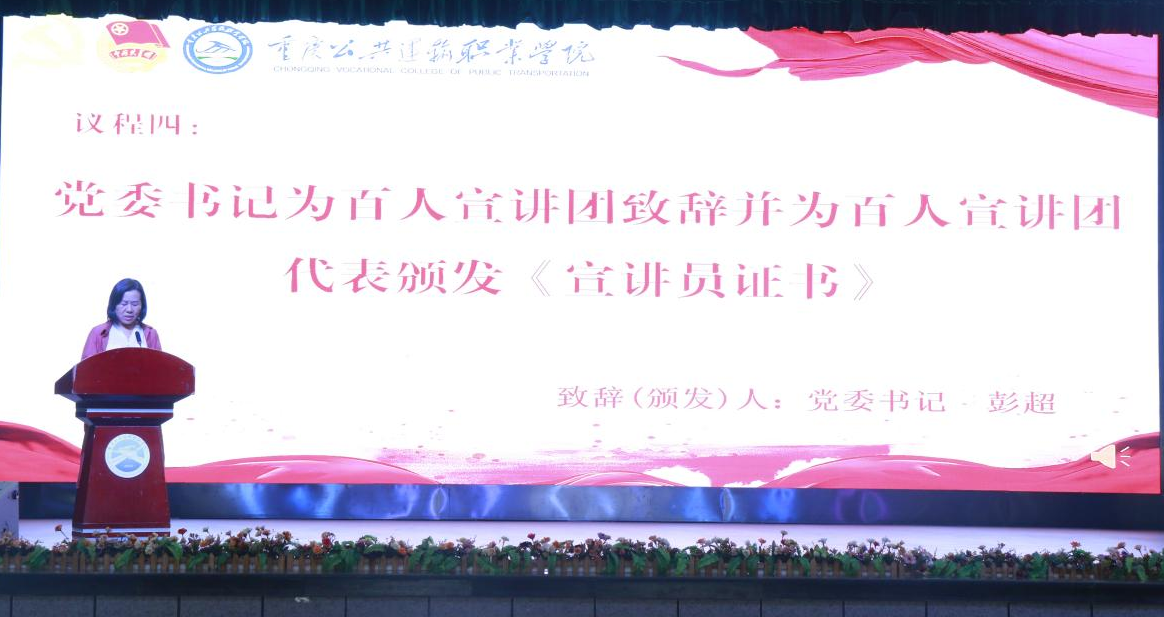 仪式上,学校团委书记彭余通报2022年“百人宣讲团”宣讲安排,副校长刘畅、学校党委书记彭超分别为宣讲团颁发重庆市高校团学“一校一品”优秀团学品牌证书、为宣讲团成员代表颁发宣讲团成员聘书。