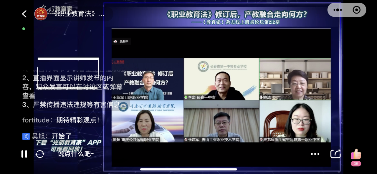 6月7日上午,学校党委书记彭超受邀参加光明日报社《教育家》杂志线上主题圆桌论坛活动,分享学校深化校企协同育人相关经验。