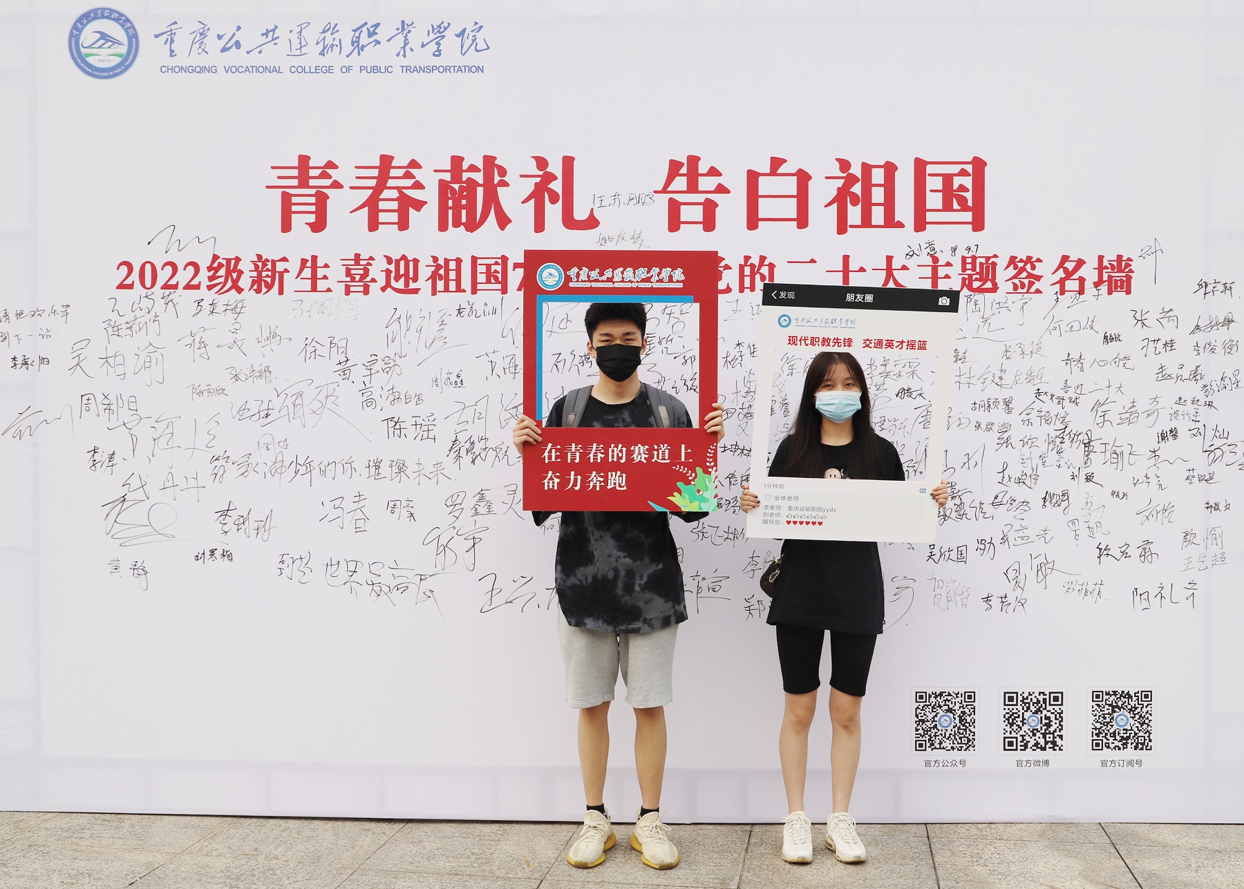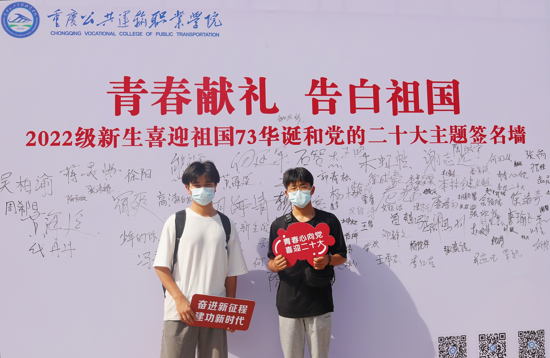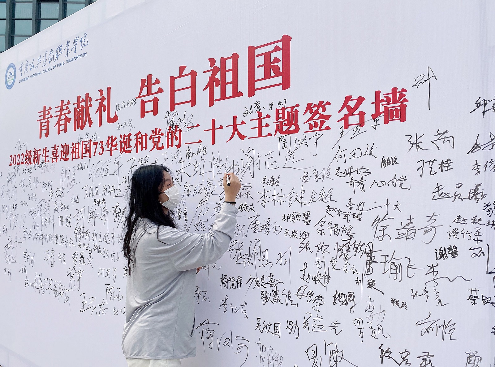 活动中,主办单位在学校科学城主校区中心位置,设置“青春献礼 告白祖国”2022级新生喜迎祖国73华诞和党的二十大大型主题签名墙,由学校大学生记者团成员引导完成校门健康、行程、核酸阴性证明、准许入校凭条核验和现场核酸采样的新同学,在签名墙上郑重签上自己的名字,签上对祖国73华诞和党的二十大胜利召开的祝福、对大学生活的期许,并合影留念。