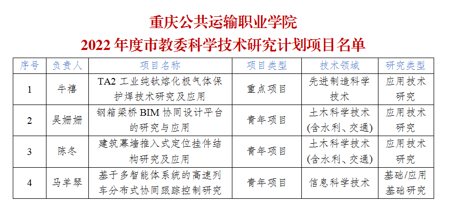 获得重点项目立项的项目是由学校科研处负责人牛禧博士主研的应用技术研究型、先进制造科学技术领域项目《TA2工业纯钛熔化极气体保护焊技术研究及应用》,3个青年项目分别为由铁道与建筑学院吴姗姗老师负责的《钢箱梁桥BIM协同设计平台的研究与应用》、公共管理学院陈冬老师负责的《建筑幕墙推入式定位挂件结构研究及应用》与轨道交通学院马羊琴老师负责的《基于多智能体系统的高速列车分布式协同跟踪控制研究》。