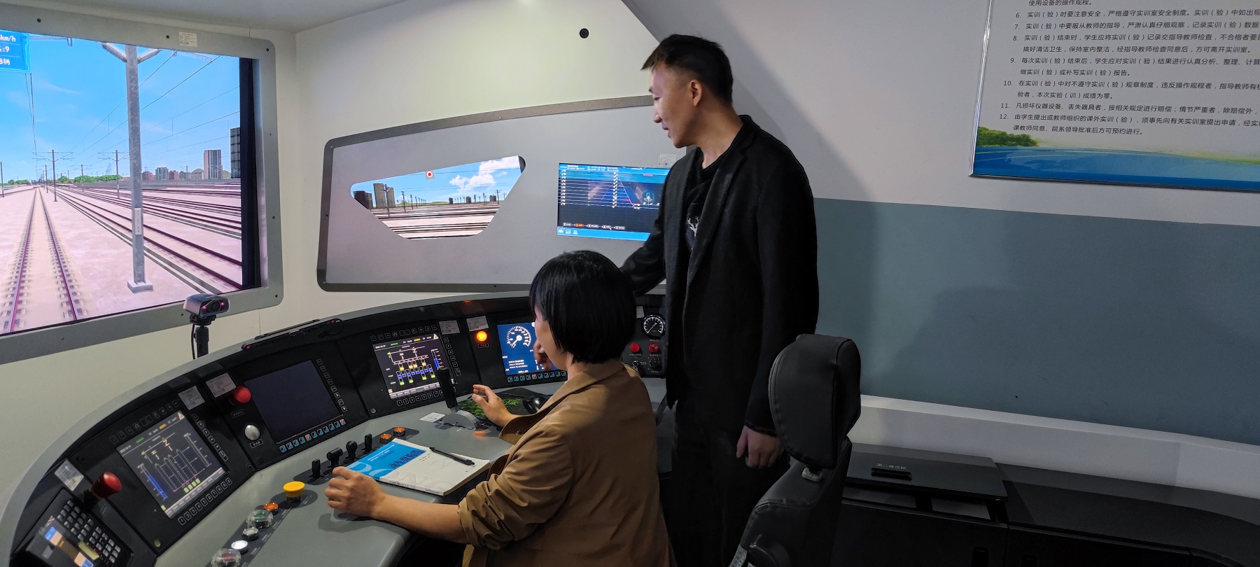座谈结束后,邱稀、杨龙在张东旭的陪同下,到学校全国城轨与高铁共享实训基地等进行实地调研。