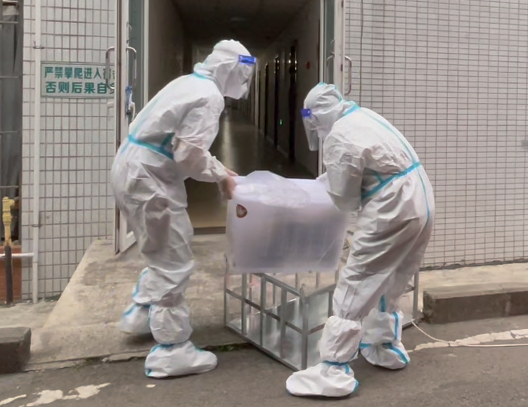 模拟用餐结束后,由保洁人员对各寝室门外装有餐余垃圾袋的垃圾桶进行消毒消杀,并利用吊机将垃圾袋清运至暂存点,同时完成公寓通道垃圾桶的二次消杀。