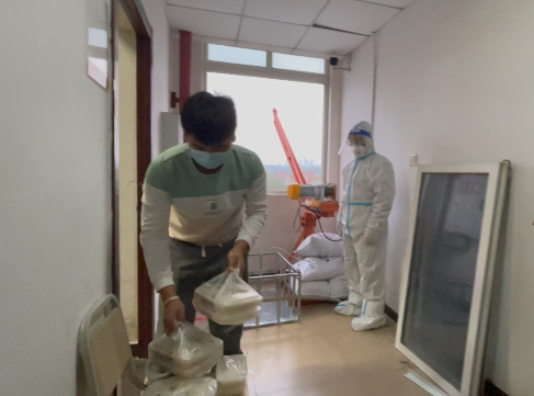 演练中,食堂送餐车按规定线路行驶至学生公寓楼下,志愿者以无接触方式完成卸货后,操作吊机将餐食送至各楼层送餐窗口,由穿戴防护服的各楼层的教师志愿者,将餐食放置在指定寝室门口的板凳上,提醒学生无接触取餐。