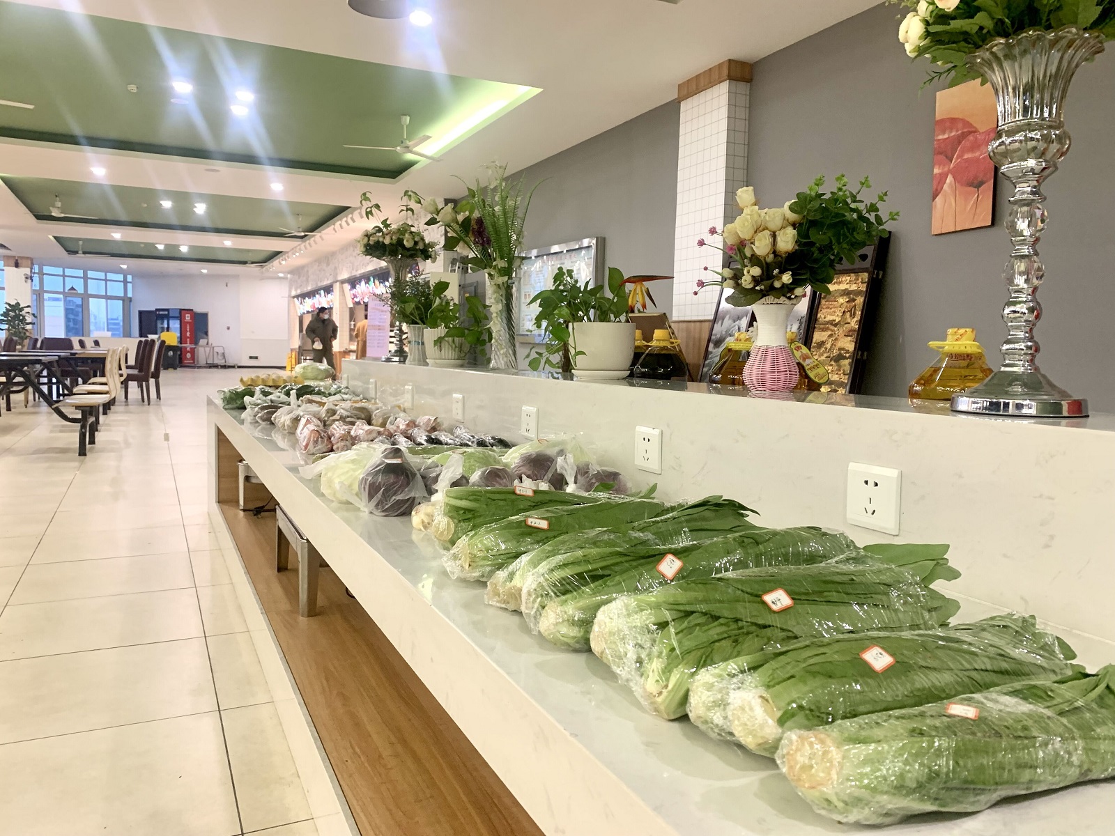 11月20日中午,到食堂三楼教师餐厅打包带饭的老师们看到,在食堂大厅平时用于摆放培训学员自助餐饭菜的桌面,被临时改装成了一个小菜市。