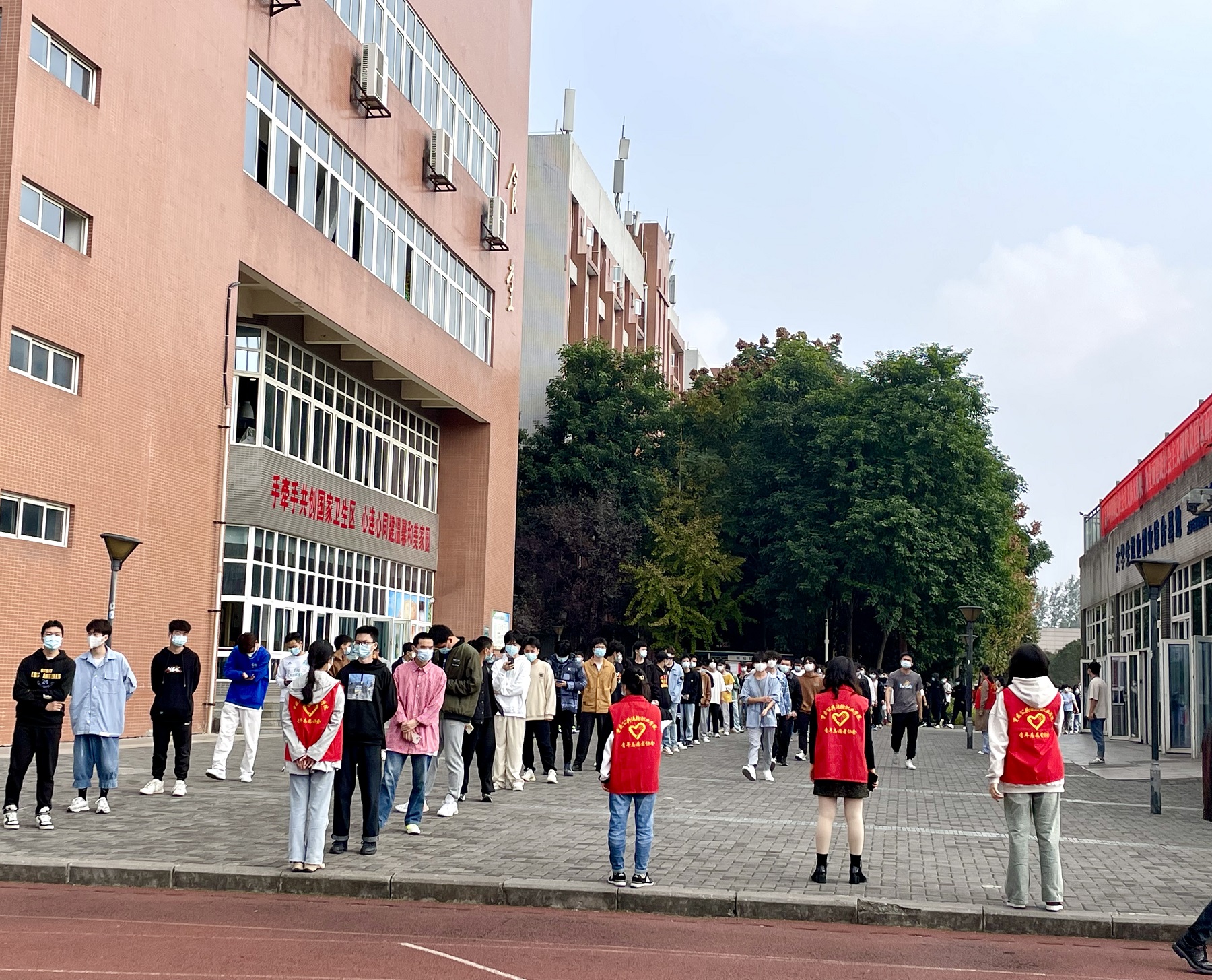 并在宿舍楼栋出入口、核酸检测排队点等环节全流程把控,确保排队间距“一米线”、人员不聚集。科学设计学生进出宿舍参加检测时的单向循环路线,确保往返不交叉。