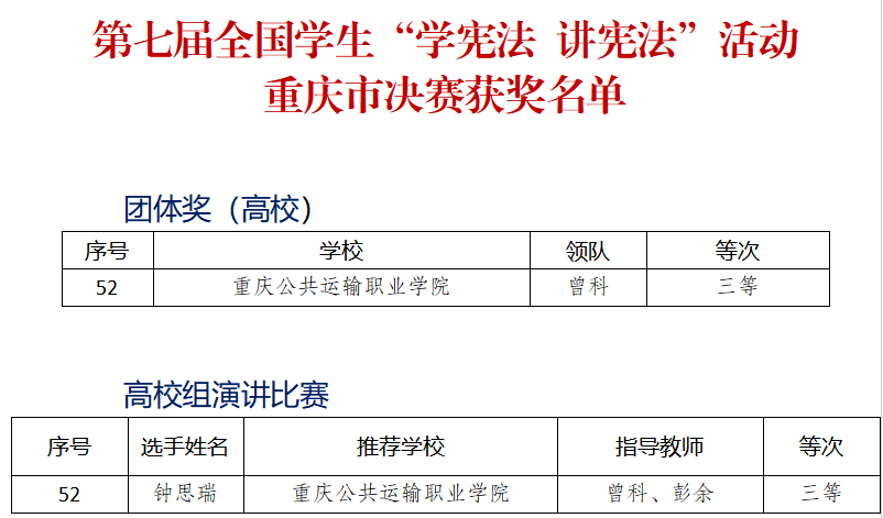 重庆市教育委员会近日公布第七届全国学生“学宪法 讲宪法”活动重庆市赛获奖名单,学校榜上有名,获得高校组团体三等奖、个人三等奖各1项。这也是学校2021年以来,连续两年摘得该比赛团体与个人奖项。