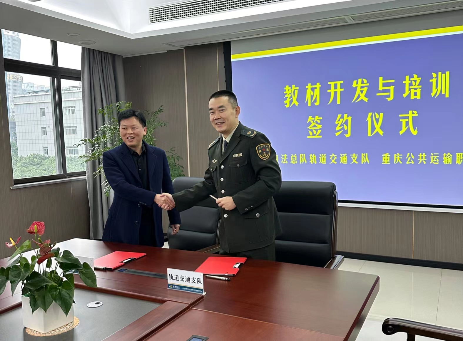 会上,重庆交通开投集团董事会秘书、办公室主任、学校董事长张东旭,市交通综合执法总队轨道支队党委书记、支队长高乐睿,代表学校和支队签署培训教材开发及合作协议,与会人员围绕培训教材开发、轨道执法培训合作等进行深入交流。