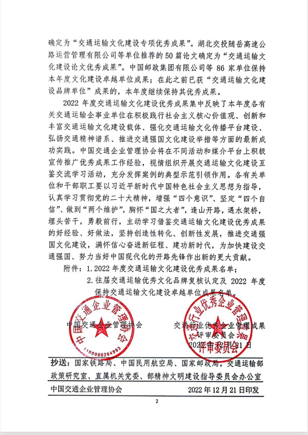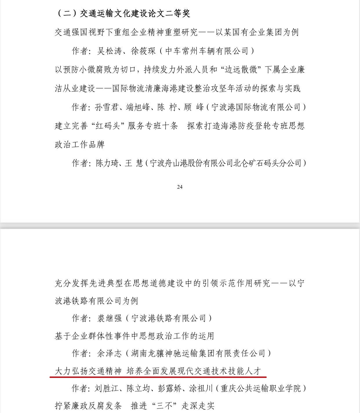 当前位置:首页 > 新闻中心 > 学校动态 > 学校动态 学校喜获全国交通运输文化建设优秀论文二等奖 来源:学校动态发布时间:2022-12-23 13:03访问量: 中国交通企业管理协会于12月21日专门发出通知,公布2022年度交通运输文化建设优秀成果获奖名单,学校榜上有名,喜获交通运输文化建设优秀论文二等奖。 获奖的论文为学校党委宣传部提交的论文《大力弘扬交通精神 培养全面发展现代交通技术技能人才》。 (文/科研处牛禧 编辑/涂祖川 审核/陈立均 彭露娇 终审/文月工)