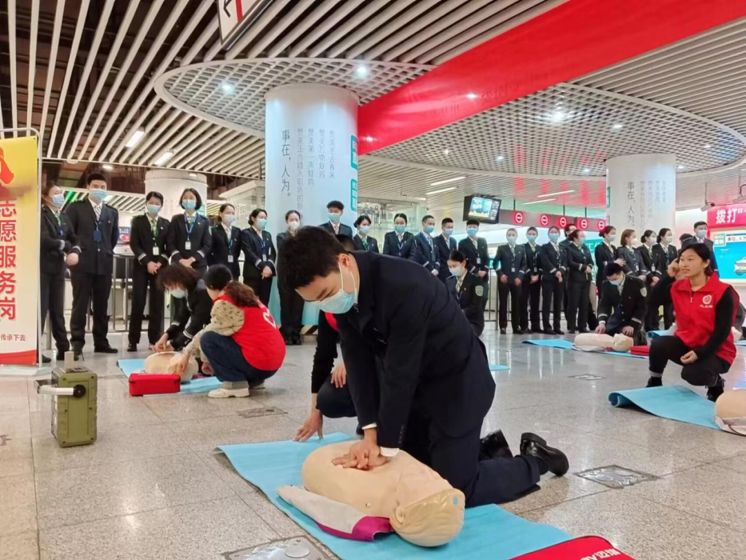 在重庆轨道交通1号线两路口站,学校团委与重庆轨道集团运营一公司团委、重庆市急救医疗中心团委,联合开展轨道交通应急急救培训展示活动,通过邀请医生现场指导、开展模拟演练等形式,向广大旅客普及心肺复苏、气道异物梗塞、ADE使用操作等急救理论与施救技巧。