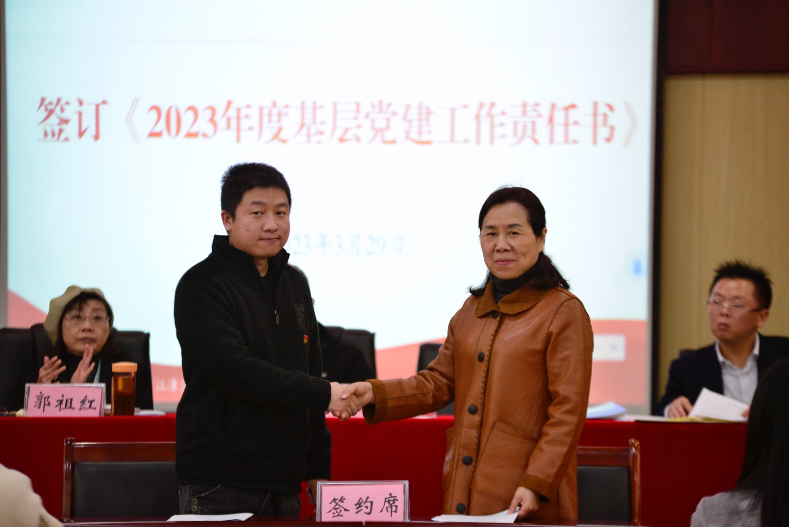 学校党委书记彭超与基层党组织书记代表,运输贸易学院党总支书记曾庆东、中职教学党支部书记何元乐签订《2023年度基层党建工作责任书》。