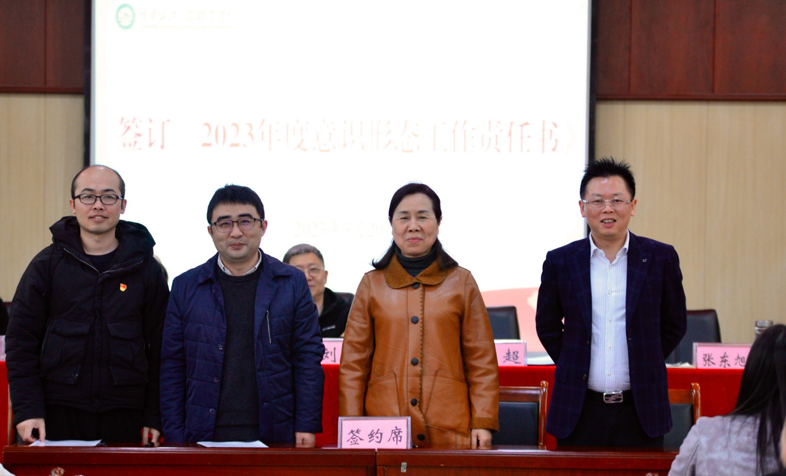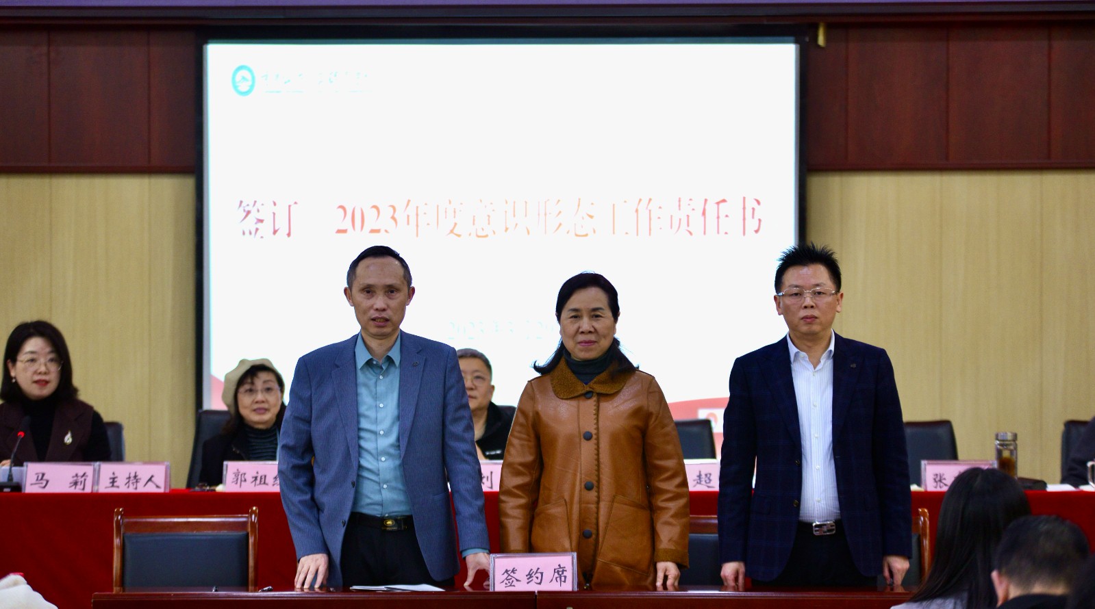 学校党委书记彭超、党委副书记张东旭与各二级单位代表,智慧交通与铁建联合党总支郭昌盛、智慧交通学院院长牟刚、公共管理学院院长黄江签订《2023年度意识形态工作责任书》。