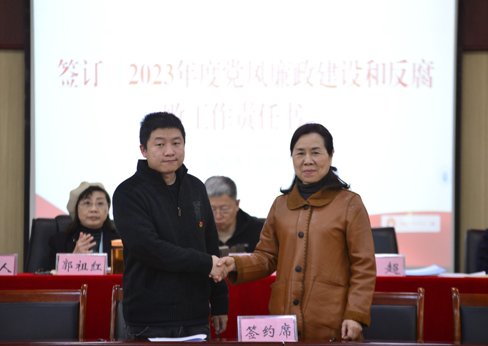 学校党委书记彭超与基层党组织书记代表,运输贸易学院党总支书记曾庆东、中职教学党支部书记何元乐签订《2023年度党风廉政建设和反腐败工作责任书》。