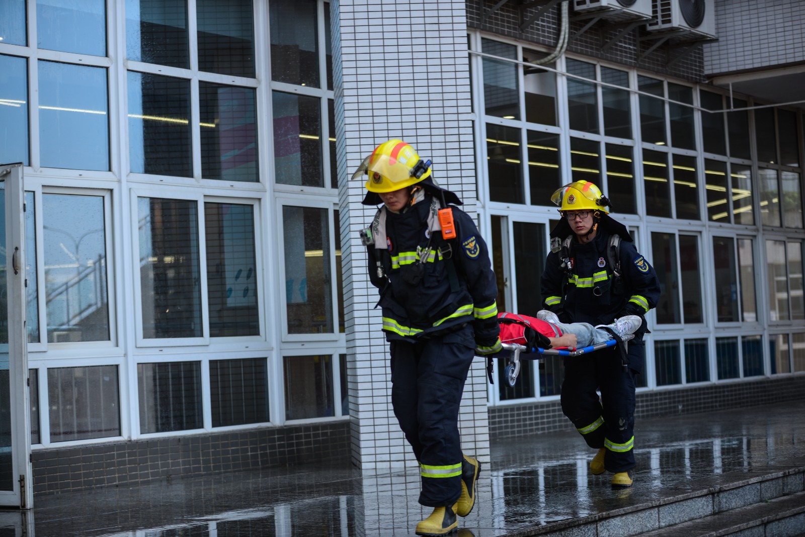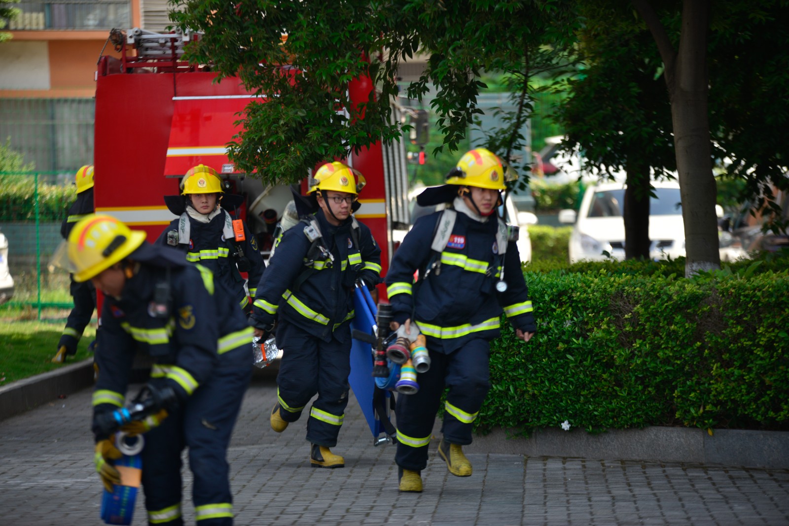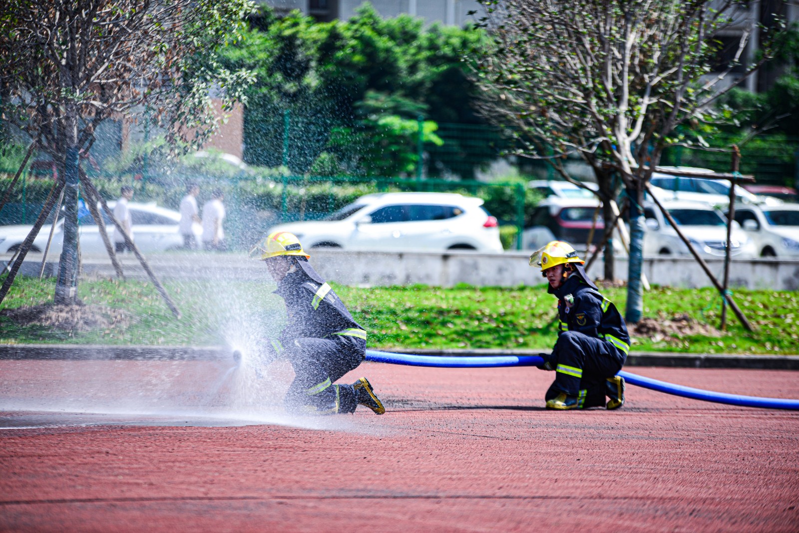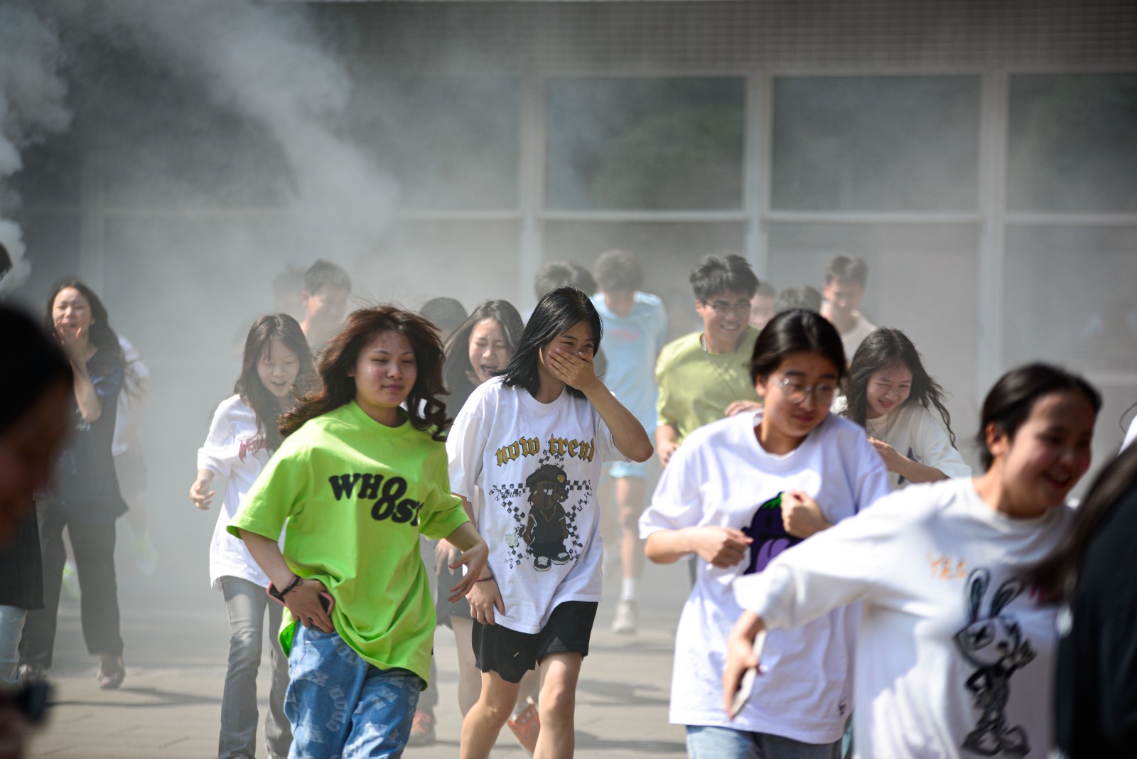 在火灾应急救援环节,模拟食堂三楼因突发火灾导致学生被困,学校应急救援队联合江津区双福消防救援站工作人员,立即展开对被困学生的搜救和火场的扑灭工作,现场教授用消防水和灭火器应急救援的方法,并模拟开展相关舆情处置演练。