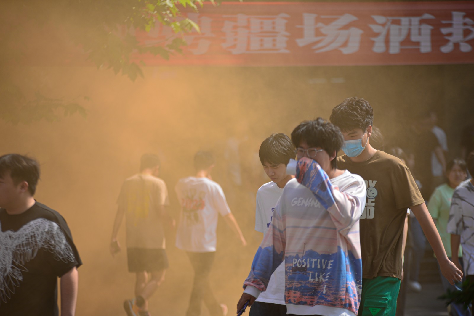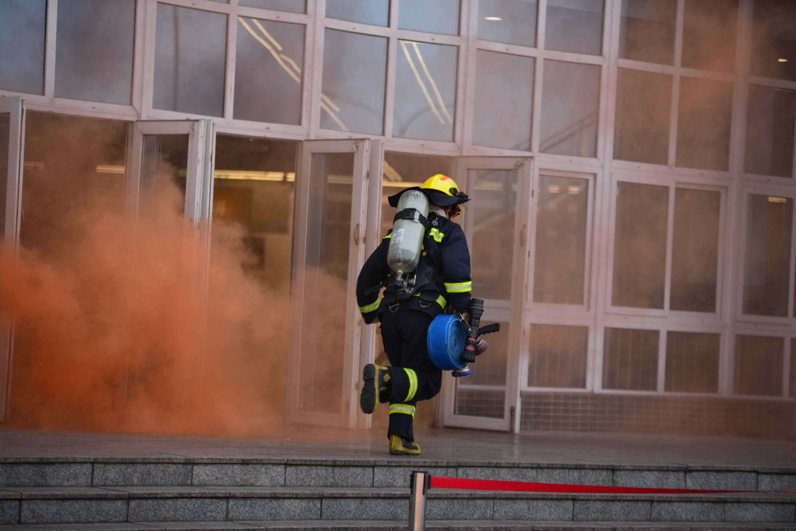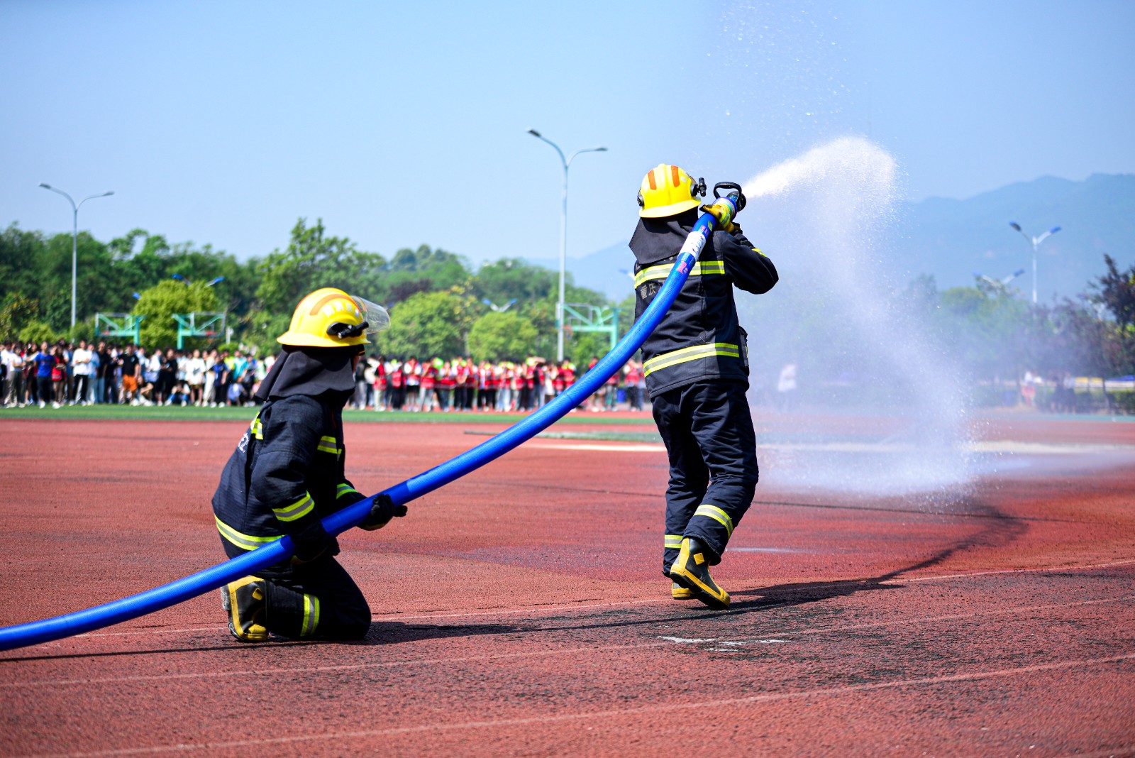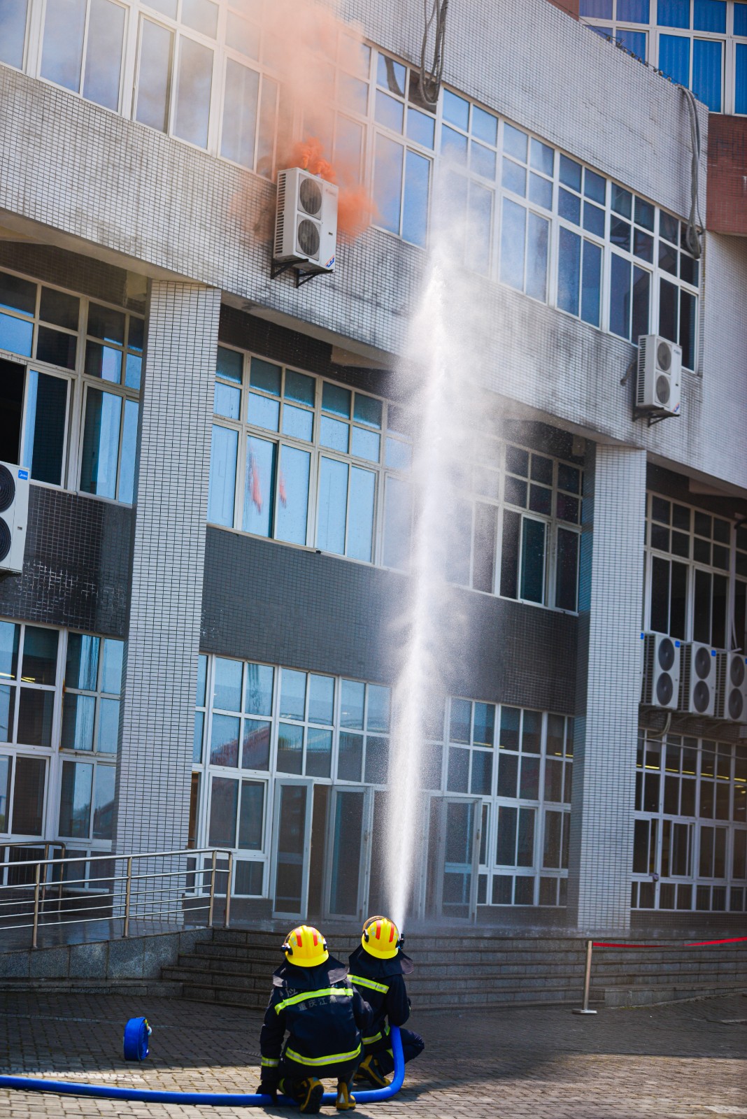 在火灾应急救援环节,模拟食堂三楼因突发火灾导致学生被困,学校应急救援队联合江津区双福消防救援站工作人员,立即展开对被困学生的搜救和火场的扑灭工作,现场教授用消防水和灭火器应急救援的方法,并模拟开展相关舆情处置演练。