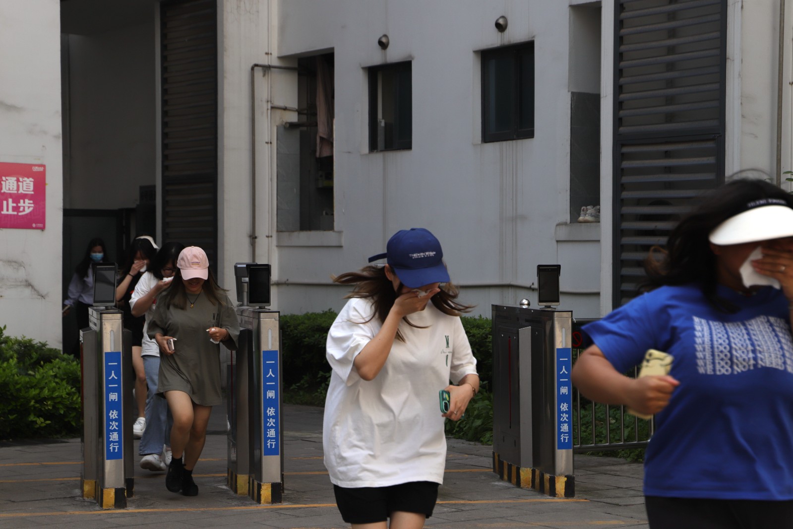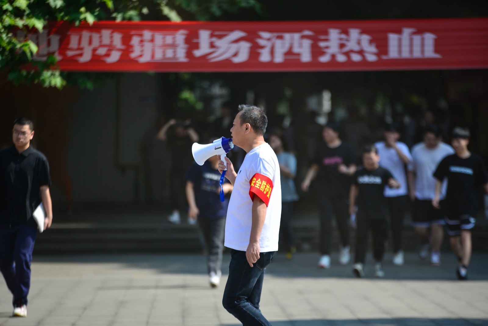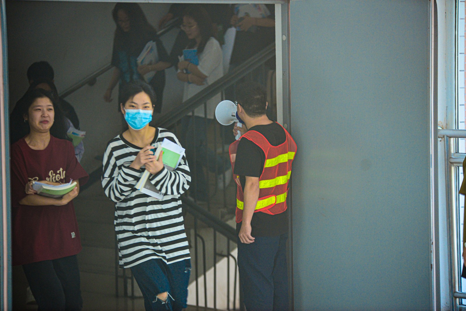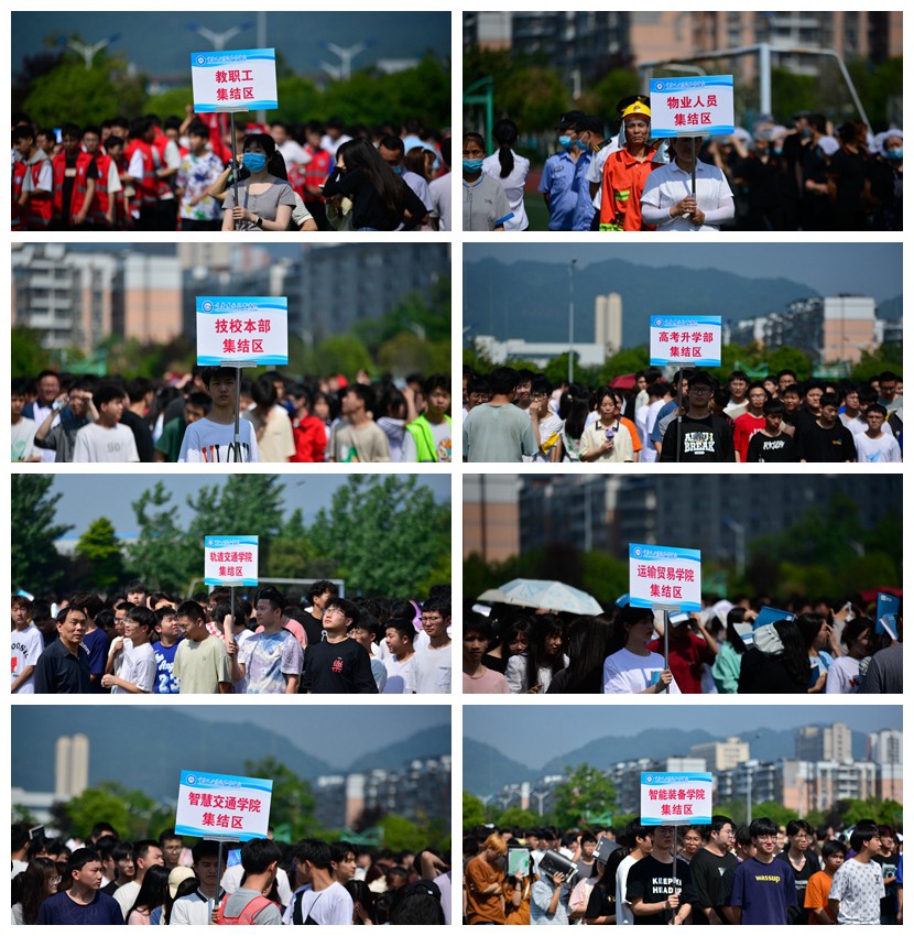 在演练的第一个环节,模拟校园突发地震险情,警报拉响后,全校师生教职员工根据应急广播的指示,解说员大家在区域指挥员、集结员的引导下,紧急从办公楼、教学楼、学生宿舍、食堂等场所的各个疏散通道,迅速撤离至学校操场区域集结点集结避险,完成集结后,各支队伍迅速向应急演练副总指挥报告疏散情况。