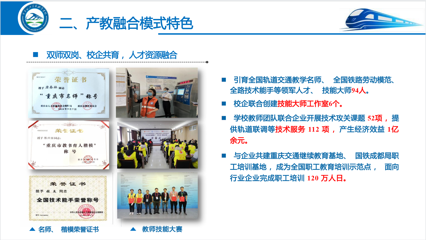 加大科教融汇工作力度,校企联合创建技能大师工作室6个,学校教师团队联合企业开展技术攻关课题52项,提供轨道联调等技术服务112项,产生经济效益1亿余元。与企业共建重庆交通继续教育基地、国铁成都局职工培训基地,成为全国职工教育培训示范点,面向行业企业完成职工培训120万人次。