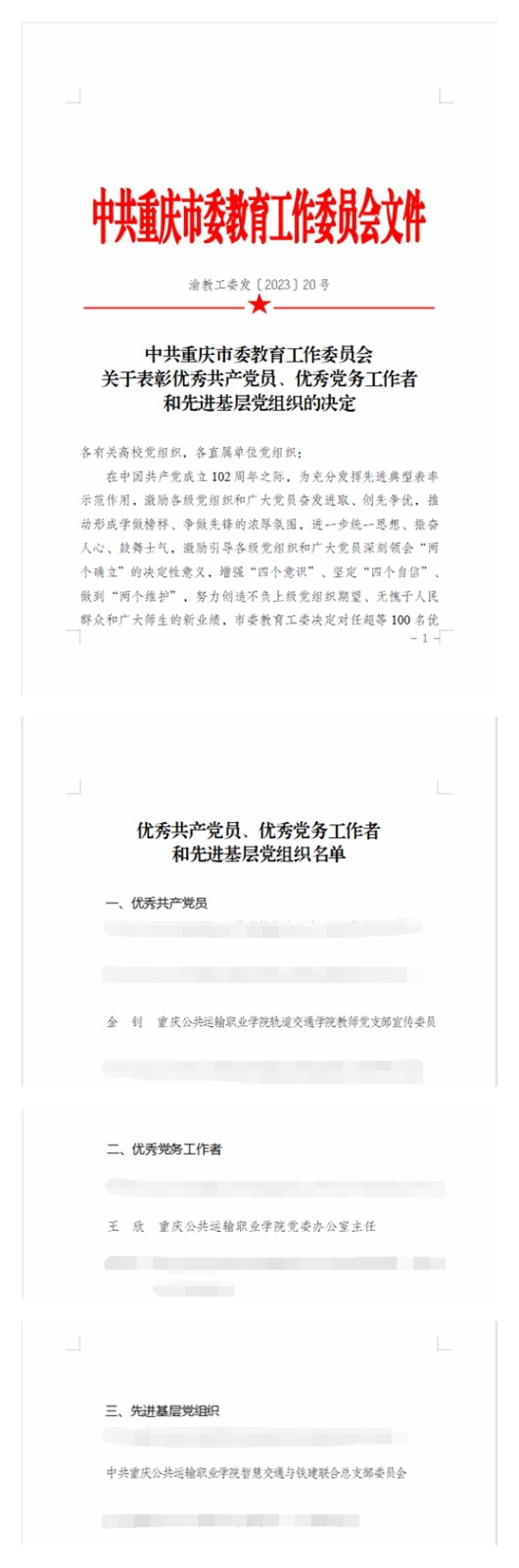 其中,学校轨道交通学院教师金钊被市教委评为优秀共产党员,党委办公室主任王欣被市教委评为优秀党务工作者,智慧交通与铁建联合总支部委员会被市教委评为先进基层党组织,安保处杨华被市教委评为2022年高校大学生征兵工作成绩突出个人,组织部党务干事张钰环被重庆交通开投集团命名为“党员先锋岗(个人)”。