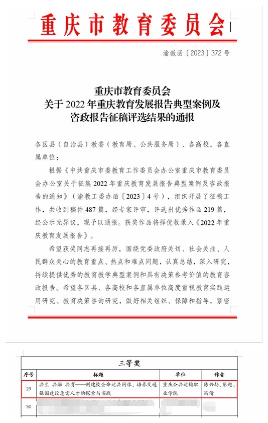 获奖案例为学校教务处提交的、题为《共生 共融 共育——创建校企命运共同体,培养交通强国建设急需人才的探索与实践》的教育发展案例。