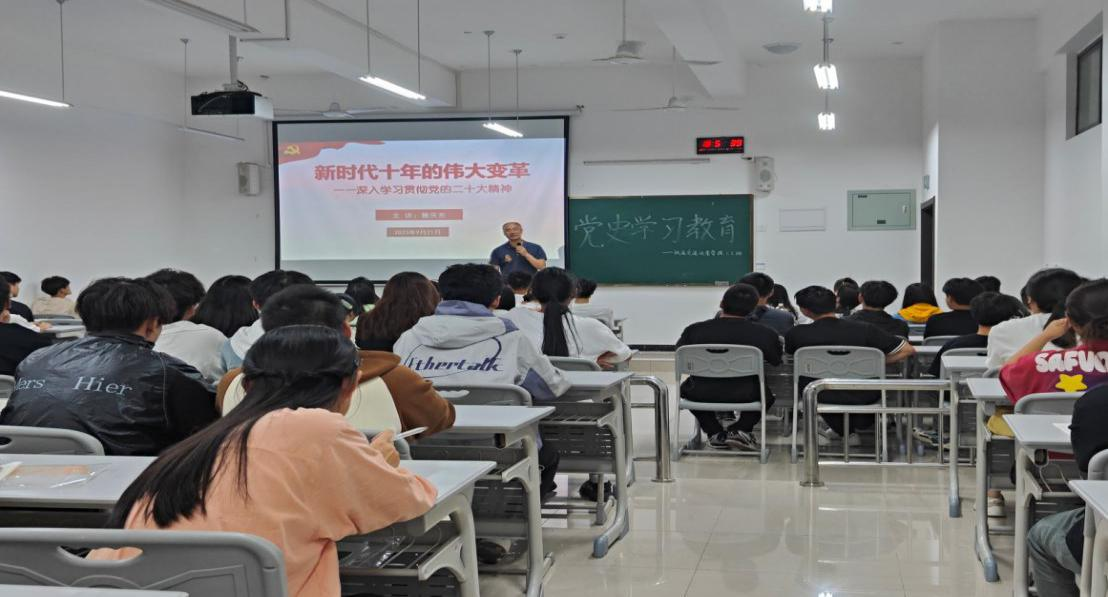 同日晚,运输贸易学院党总支书记曾庆东在主校区教学楼A栋105教室,面向学院学生党员和青年学生代表,讲授题为“新时代十年的伟大变革”的专题党课,围绕新时代十年伟大变革的里程碑意义,对党的二十大报告进行深入阐释、系统解读。