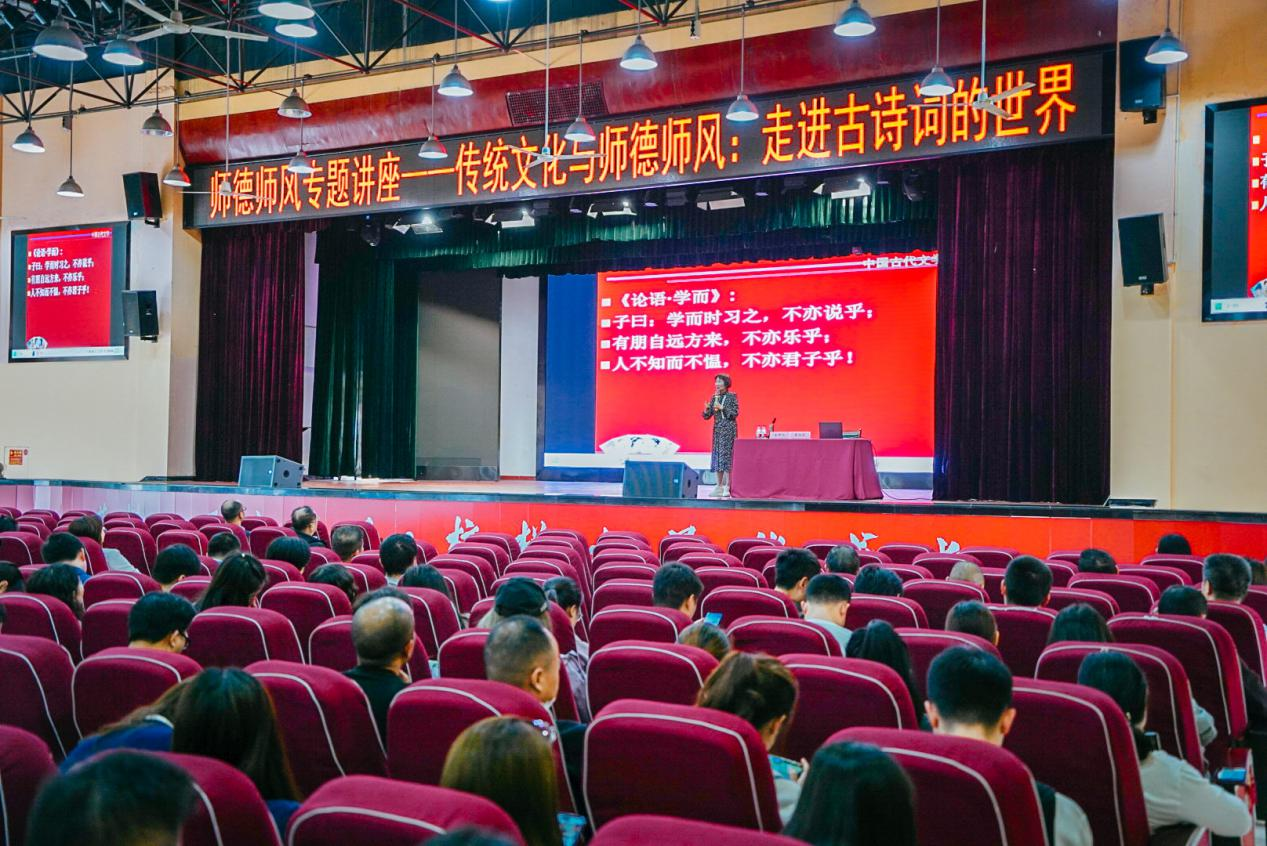 讲座以“传统文化与师德师风:走进古诗词的世界”为题,通过用唱、读、讲、传等活泼的形式,对《论语·学而》《孟子·尽心上》《诗经·卫风·木瓜》等经典诗歌进行细致讲解,生动展示如何从古诗词中汲取国学智慧,感受优秀传统文化的魅力,不断提升自身师德修养,更好地肩负起为党育人、为国育才的时代重任,引导广大教师提高政治站位、坚定职业信仰,以德立身、以德立学、以德施教、以德育德,争做“四有”好老师。