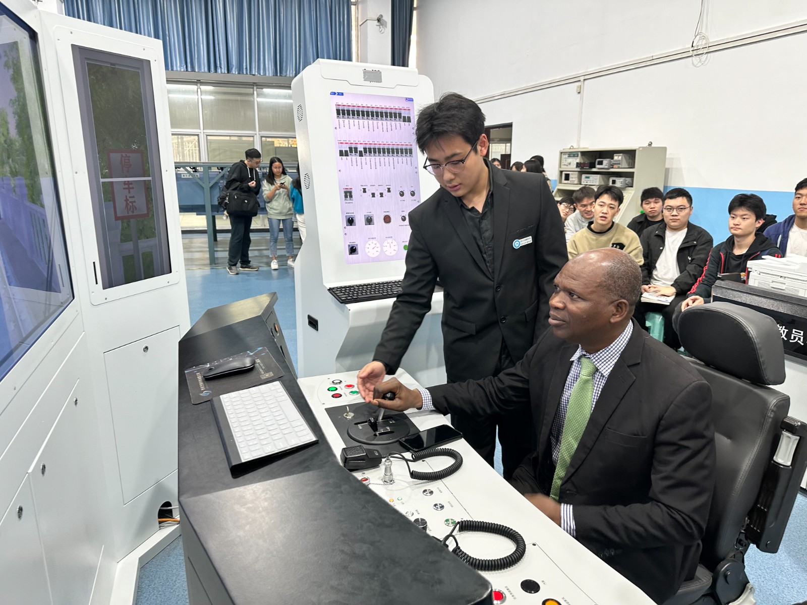 座谈开始前,穆穆尼等到学校全国城轨与高铁技术共享实训基地、轨道交通多网融合实训中心、虚拟仿真实训中心实地参观。