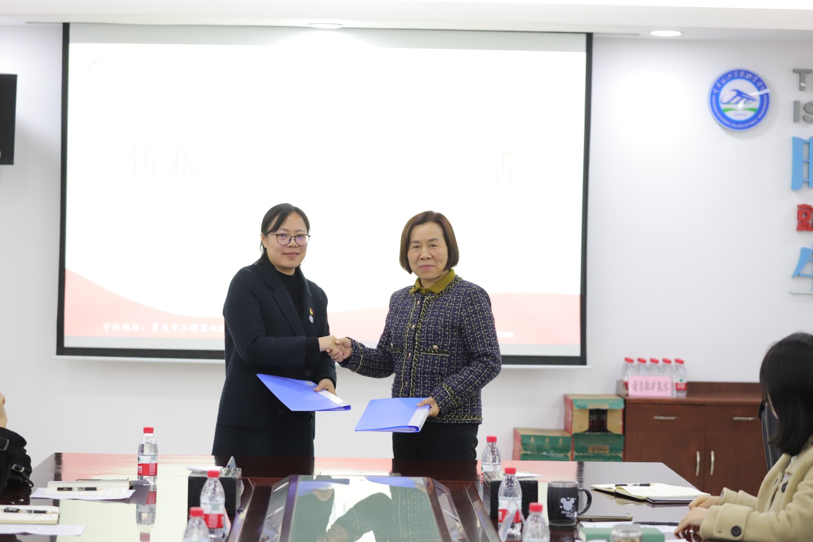学校党委书记彭超与新任轨道交通学院党总支书记钟馨怡签订岗位目标责任书,学校副校长刘畅与新任实训中心副主任王轶签订岗位目标责任书。