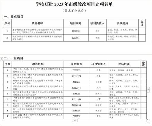 其中,由轨道交通学院王玲老师主持的《基于城轨高水平专业群核心专业铁道机车运用与维护的“双元三阶两创”人才培养模式探索与实践》、由智慧交通学院牟刚老师主持的《铁道信号自动控制高水平专业群产教融合实训基地的探索与研究》2个项目成功获批市级重点教改项目;由公共管理学院孔巧老师主持的《国际传播视域下交通类专业高职英语教学改革研究与实践》、轨道交通学院邓勇老师主持的《四‘胞’互动、校企协作”建设教师教学创新团队的研究与实践》等9个项目立项市级一般教改项目。