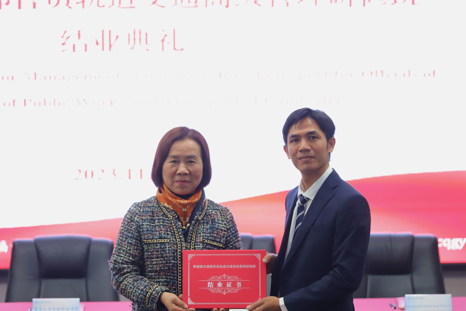 仪式上,学校党委书记彭超为参加学校和柬埔寨洪森公共工程与运输学院联合举办的柬埔寨交通部官员轨道交通高级管理研修班的学员代表金吾烈颁发结业证书,并介绍学校办学和国际交流与合作情况,希望以举办本次研修班为契机和起点,发挥各方资源优势,推动共建“中柬智能交通联合实验室”与“柬埔寨‘中文+智能交通’人才培养基地”建设。