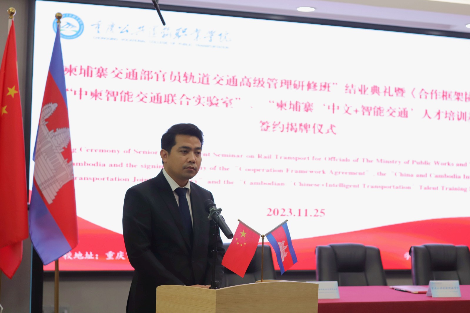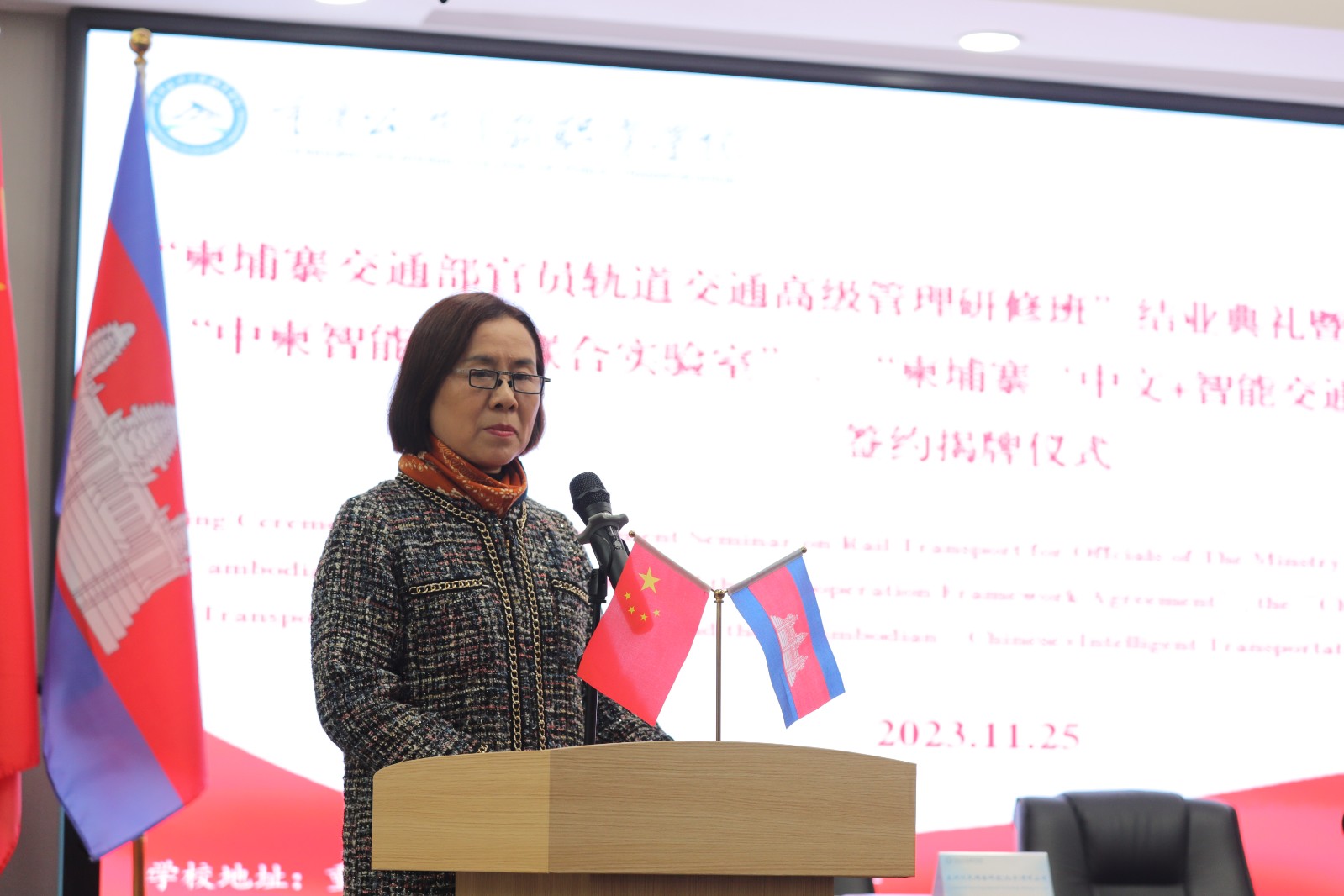 11月25日上午,学校在科学城主校区办公楼3楼会议室,举办“柬埔寨交通部官员轨道交通高级管理研修班”结业典礼暨《合作框架协议》、“中柬智能交通联合实验室”、“柬埔寨‘中文+智能交通’人才培训基地”签约揭牌仪式。