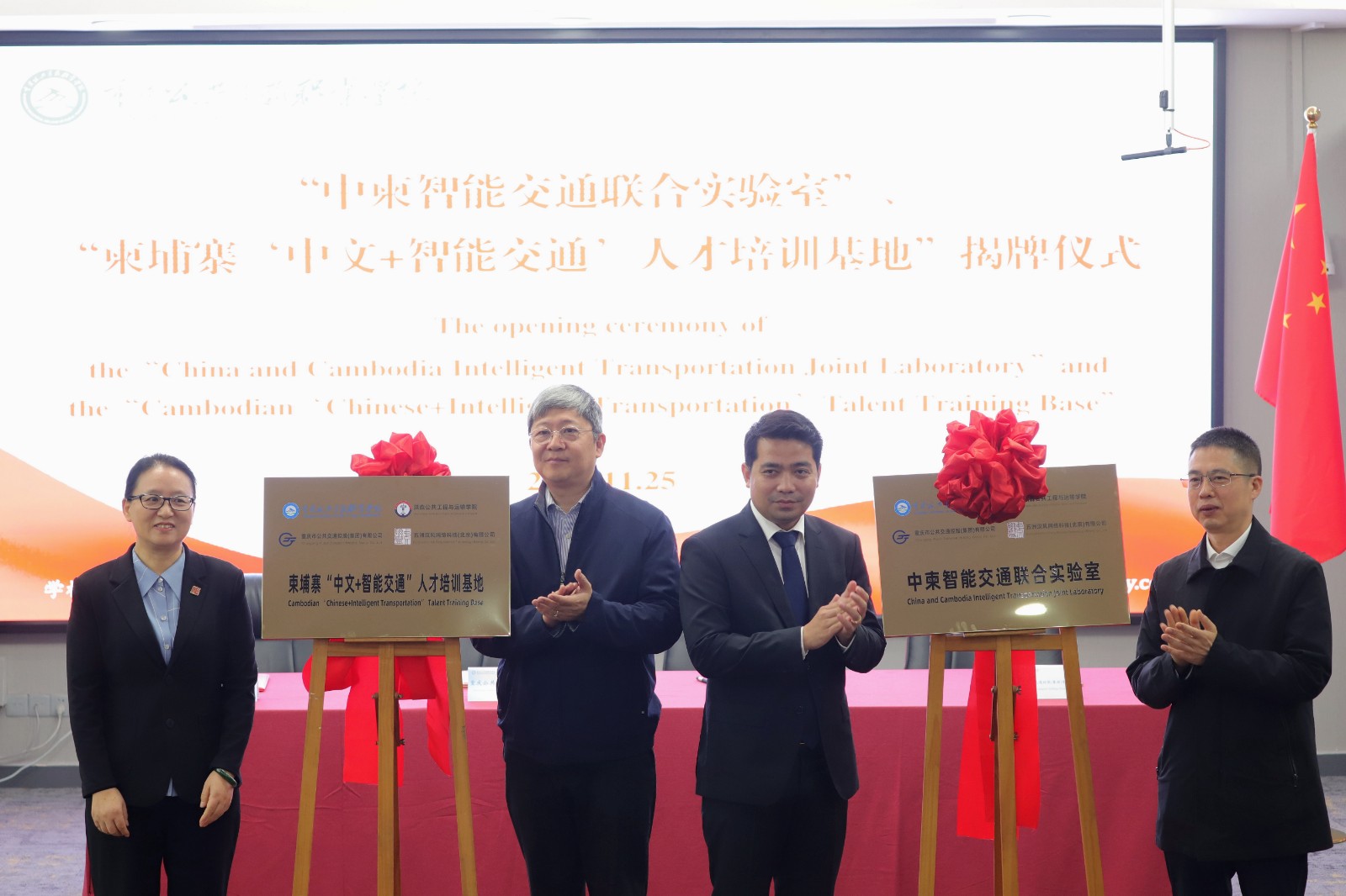 重庆公交集团监事会主席郑跃东,学校副校长刘畅,中文联盟主席、世界汉语教学学会智慧教育分会理事长、五洲汉风网络科技(北京)有限公司副总经理王锦红,洪森公共工程与运输学院副校长苏万塔共同签署《合作框架协议》,并为“中柬智能交通联合实验室”、“柬埔寨‘中文+智能交通’人才培训基地”揭牌。