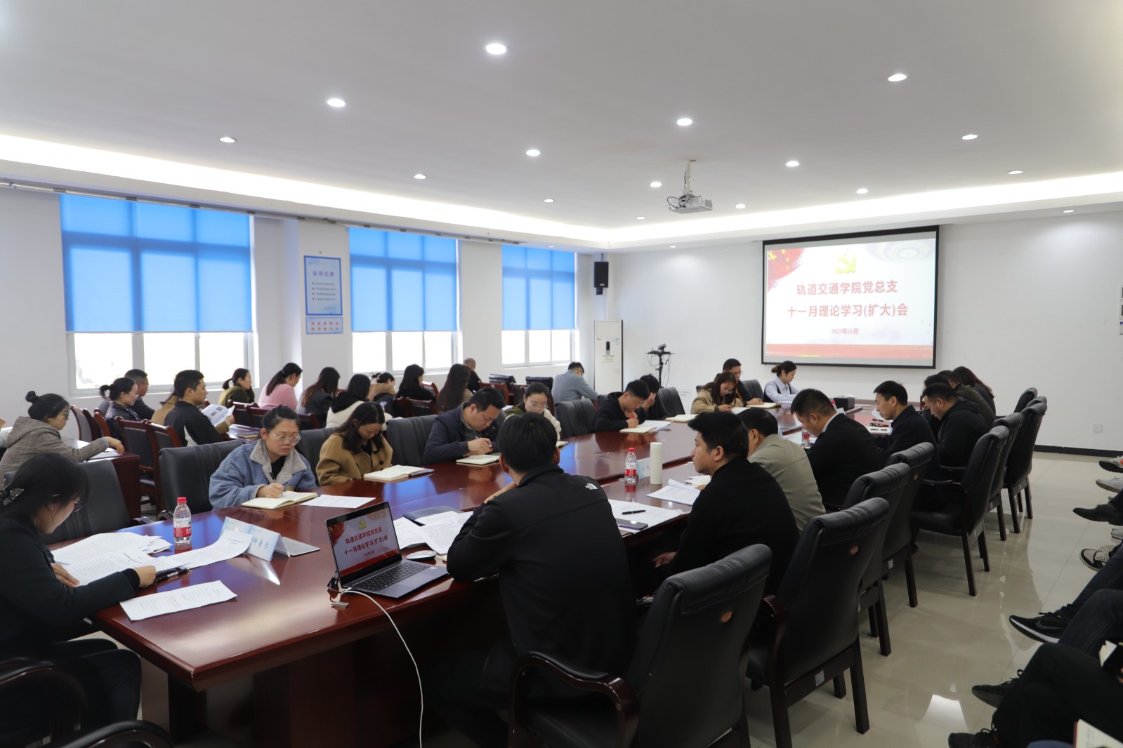 学校党委宣传部负责人及相关工作人员,轨道交通学院全体教师参加学习会。
