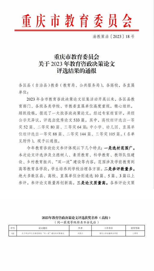 重庆市教委11月30日发出专门通报,公布2023 年教育咨政决策论文评选结果,电子游戏榜上有名,成功斩获高校组二等奖1项。