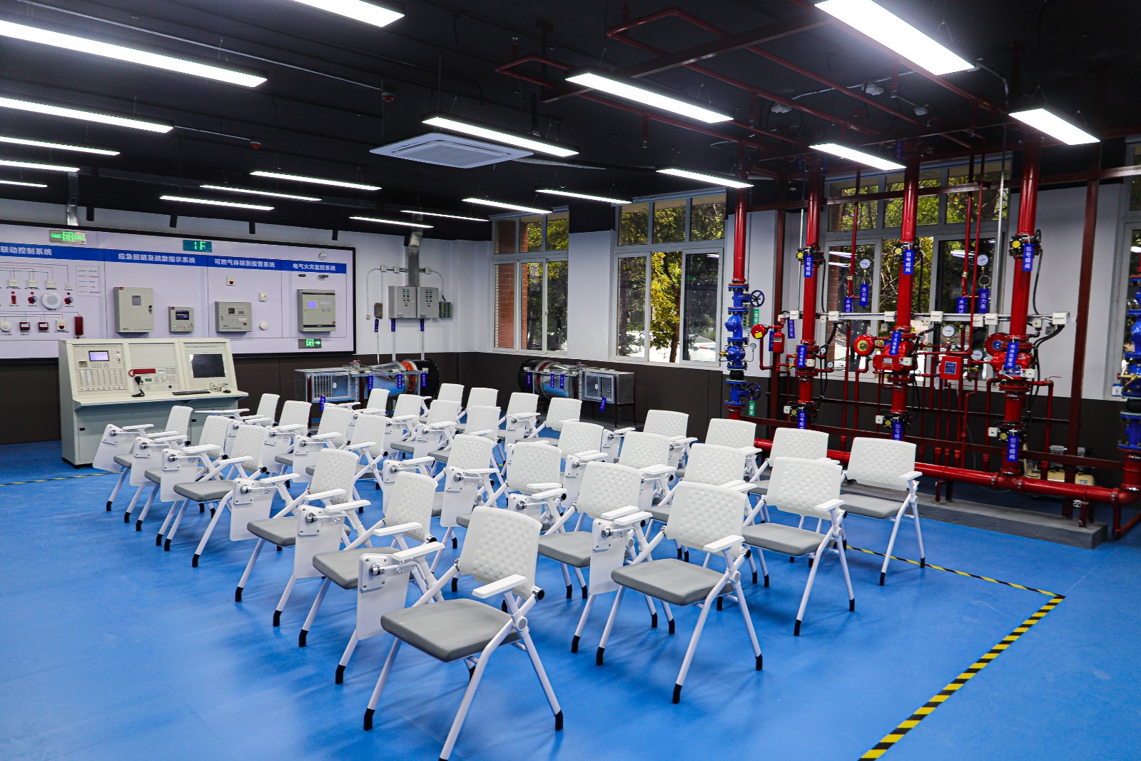 实训室对标重庆市消防职业技能鉴定工作技术要求,配有完善的实训教学和实操设施设备,涵盖消火栓灭火系统、自动喷洒灭火系统、防排烟系统、消防应急及疏散指示照明系统、报警系统、火灾报警控制器等六大板块。可同时容纳30人开展消防安全技术实训教学、技能鉴定考试,也可作为国家级职业技能大赛消防报警联动比赛标准场地,为学校下一步申办建筑消防技术及消防安全相关专业提供硬件支撑。
