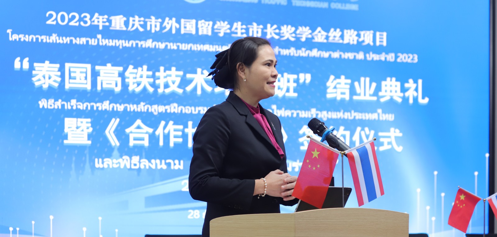 彭超在讲话中表示,结业不是结束,而是进一步深化作的开始,希望双方能够以本次培训班项目为契机,发挥好桥梁纽带作用,推动中泰校企各方,创新合作模式、拓宽合作范围、促进共同发展。