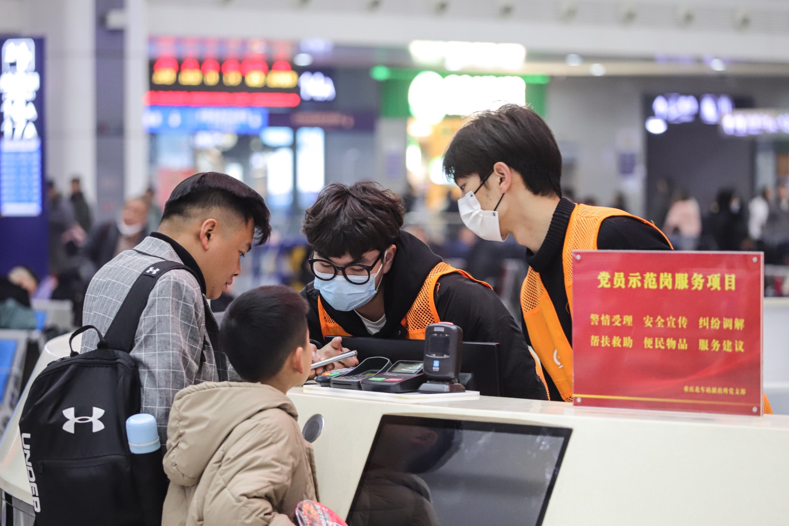 50多名志愿者,均为学校从各二级学院大一大二在校生中选拔的优秀学生代表。节日期间,他们放弃与家人亲朋团聚的机会,分布在重庆北站、永川东站、荣昌北站等铁路客运车站,重庆索道、皇冠大扶梯、礼嘉时光缆车等热点站点,协助工作人员,为假期出行旅客提供购票咨询、方位引导、重点旅客帮扶、交通安全提醒等服务,累计服务时长1800多小时。
