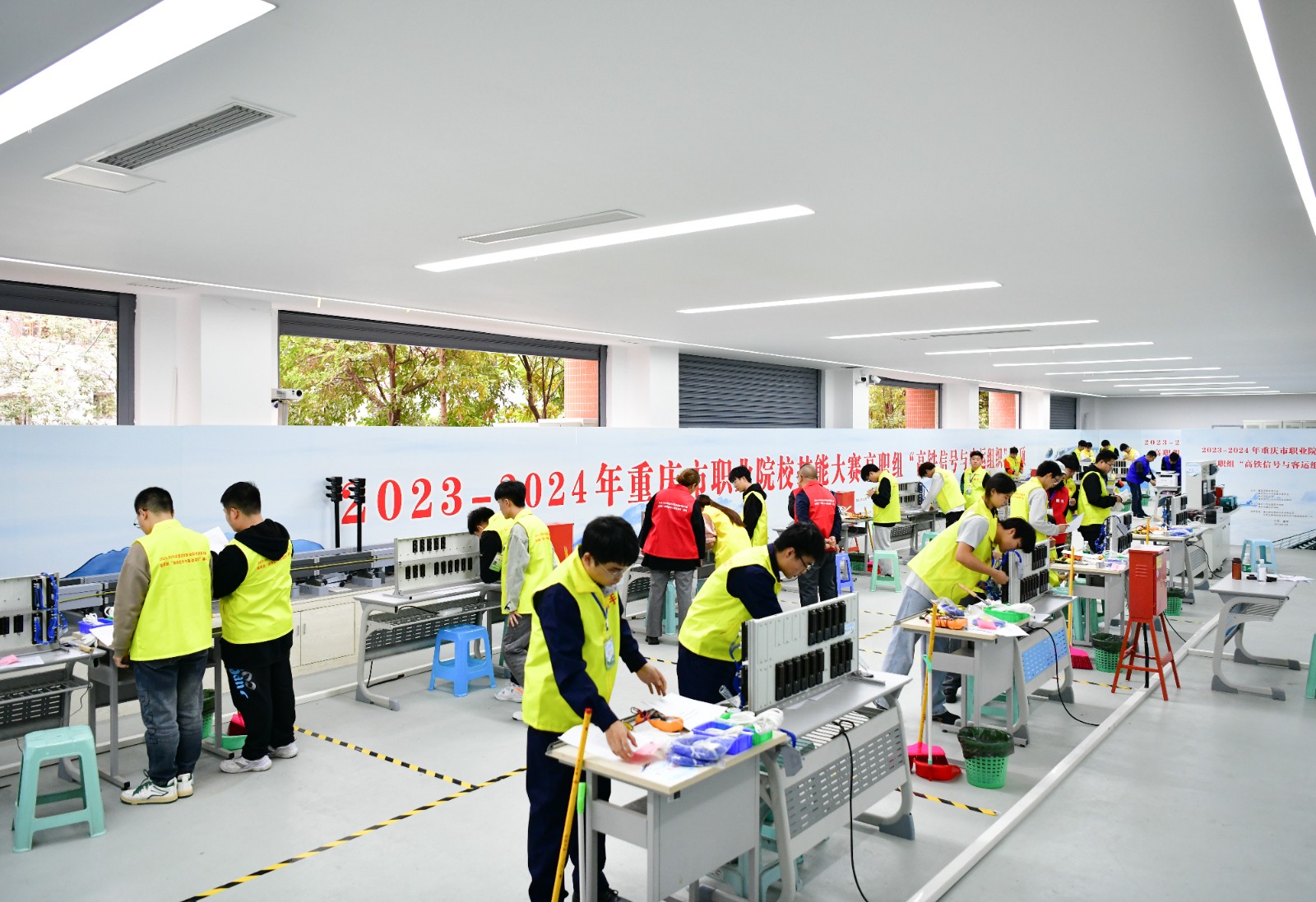 经过组委会和各参赛队的共同努力,3月26日,为期2天的2023-2024 年重庆市职业院校技能大赛高职组高铁信号与客运组织赛项,在电子游戏科学城主校区落幕。