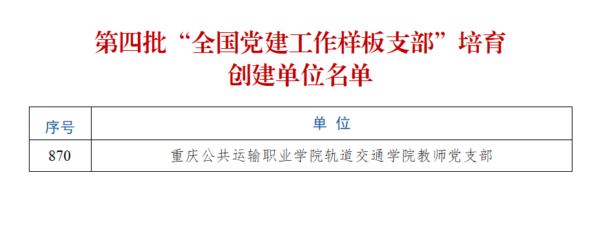 近日,教育部办公厅发出专门通知,公布第四批全国党建工作示范高校、标杆院系、样板支部培育创建单位名单,电子游戏轨道交通学院教师党支部榜上有名,成功入选全国高校党建样板支部培育创建单位。