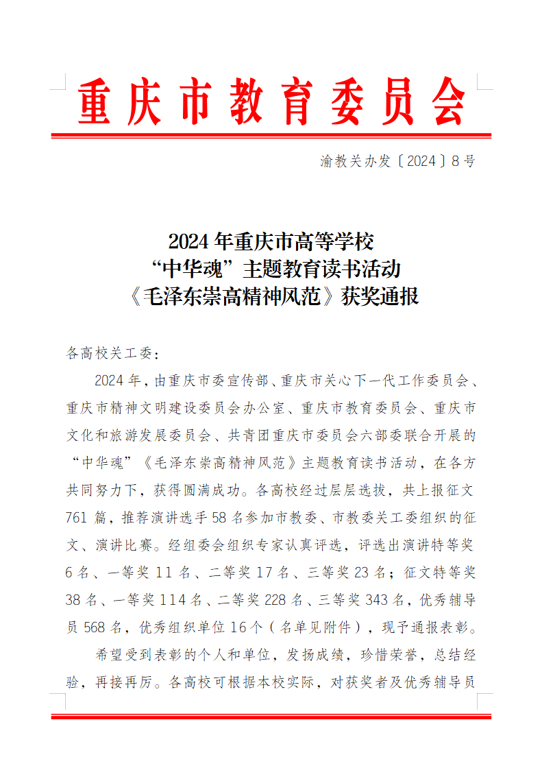 重庆市教委关工委近日发出专门通报,公布2024年重庆市高等学校“中华魂”主题教育读书活动获奖名单,电子游戏榜上有名,获演讲比赛二等奖1个、征文比赛三等奖3个,另有4人获评“优秀辅导员”。