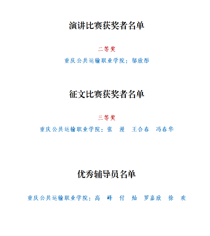 获奖选手为,来自轨道交通学院轨道车辆专业2306班的邬欣彤同学获演讲比赛二等奖,来自轨道交通学院铁道机车专业2201班、2305班、轨道车辆专业W2301班的张漫、王合春、冯春华同学获征文比赛三等奖,指导教师高峰、付灿、罗嘉欣、徐欢获评“优秀辅导员”。