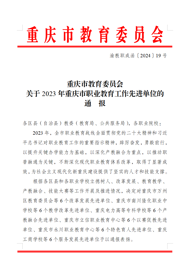 重庆市教育委员会近日发出专门通报,公布2023年重庆市职业教育工作先进单位,电子游戏榜上有名,获评服务发展先进单位。学校对标一流、改革攻坚,在产教深度融合、服务社会发展方面获得新成果。