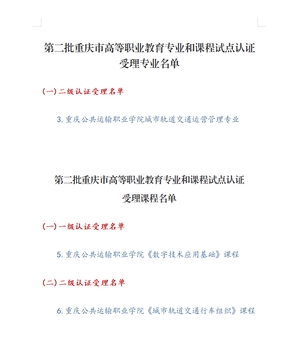 相关评选由重庆市教育评估院牵头组织,名单经过资格审查、专家组在线预审、线下集中审议等环节确定,全市共有25个专业、35门课程获准进入第二批重庆市高等职业教育专业和课程试点认证受理名单。