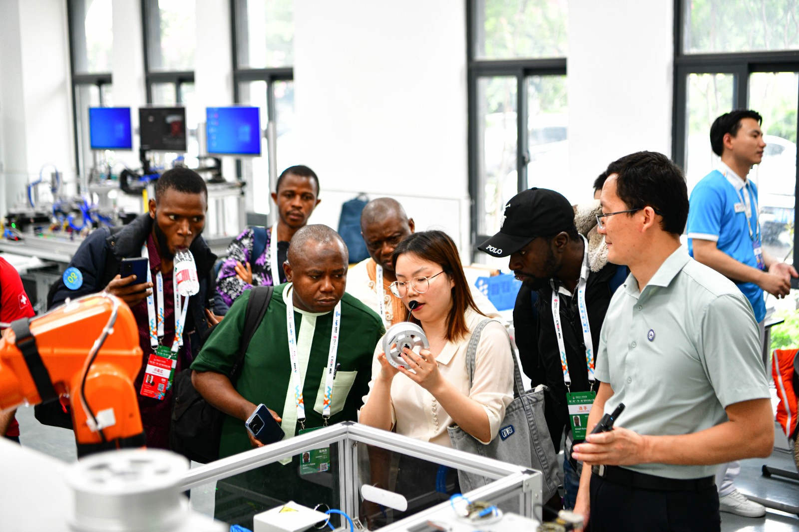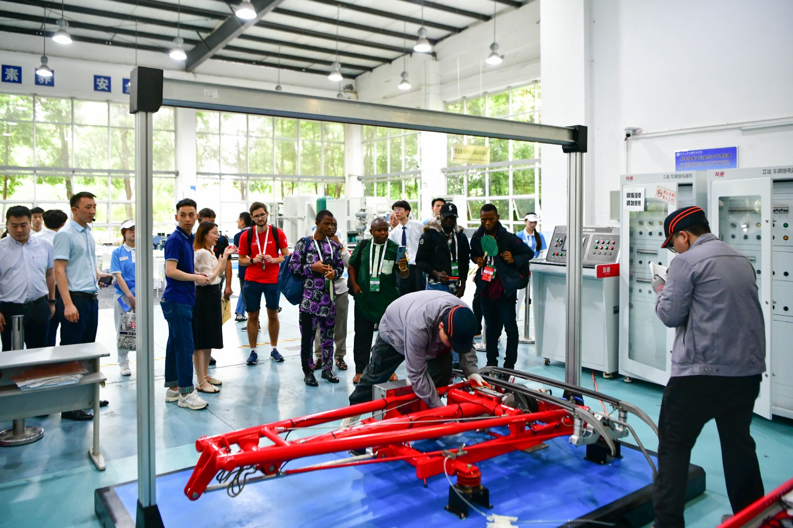 在学校科学城新校区智能装备实训基地,代表团参观了学校智能装备实训基地的新能源汽车检修、智能制造铣削设备作业、智能焊接机器人等实训项目,了解智能装备无人化操作监测流程、铣削作业精度及新能源汽车检测技术规程等内容,并前往新校区实训楼二楼,观摩跨境电子商贸运营场景、社区护理实操及幼儿教育课程组织等实训项目操作。