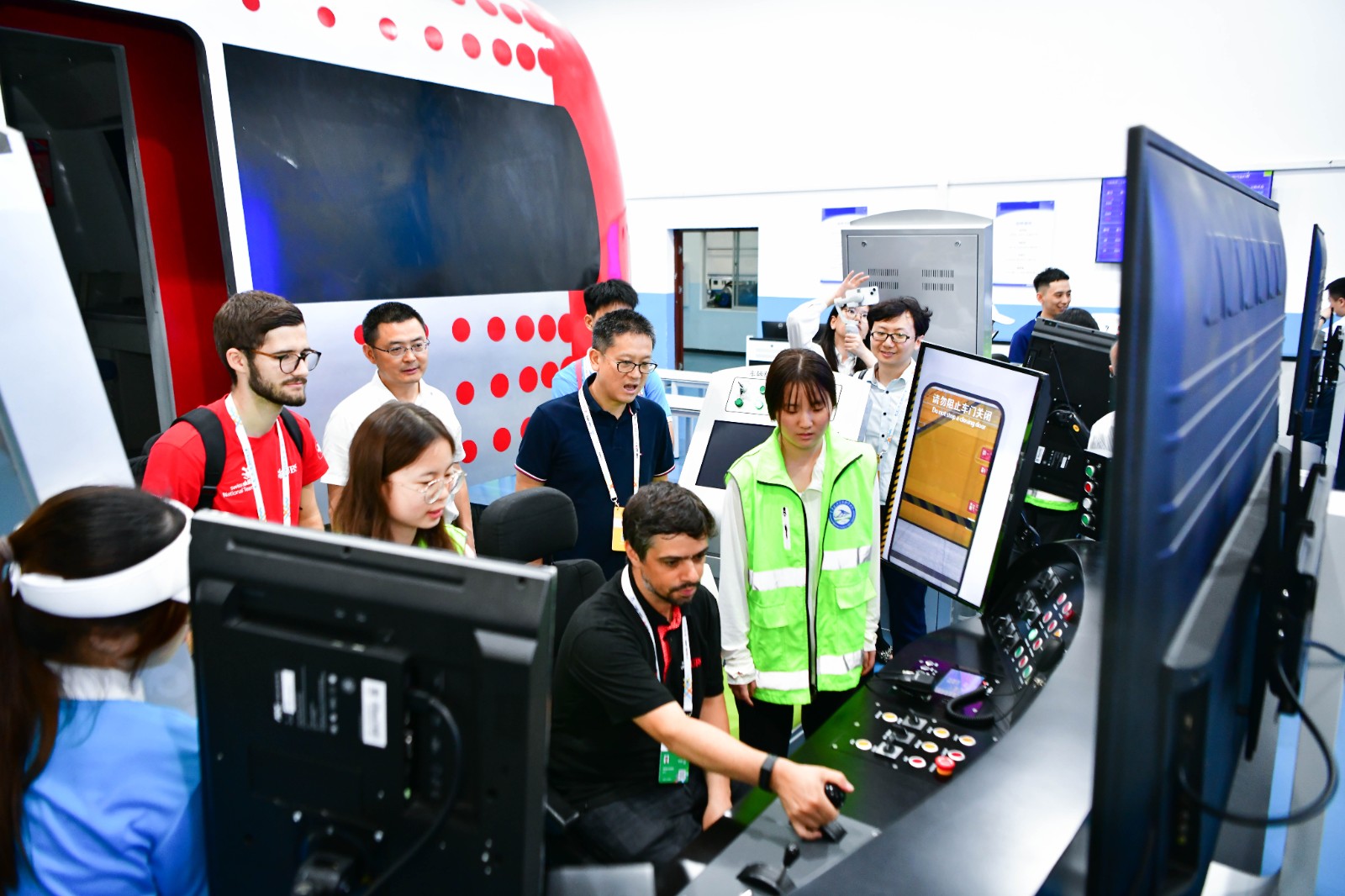 随后,4国参赛队乘车前往位于学校科学城主校区的全国城轨与高铁技术共享实训基地、轨道交通多网融合实训基地、智慧交通运维实训室、虚拟仿真实训基地等处,通过体验城轨列车模拟驾驶、观摩城市轨道交通沙盘跨线运营、参观多网融合实训系统设计及沉浸式操作虚拟仿真交互式设备等形式,详细了解学校在铁道交通、城市轨道交通等领域实训教学条件建设、智慧交通科技研发、技术技能人才培养等情况,与学校获得2022年金砖国家职业技能大赛全国一等奖的教授级高级工程师龚清林等专家教授代表进行深入交流。