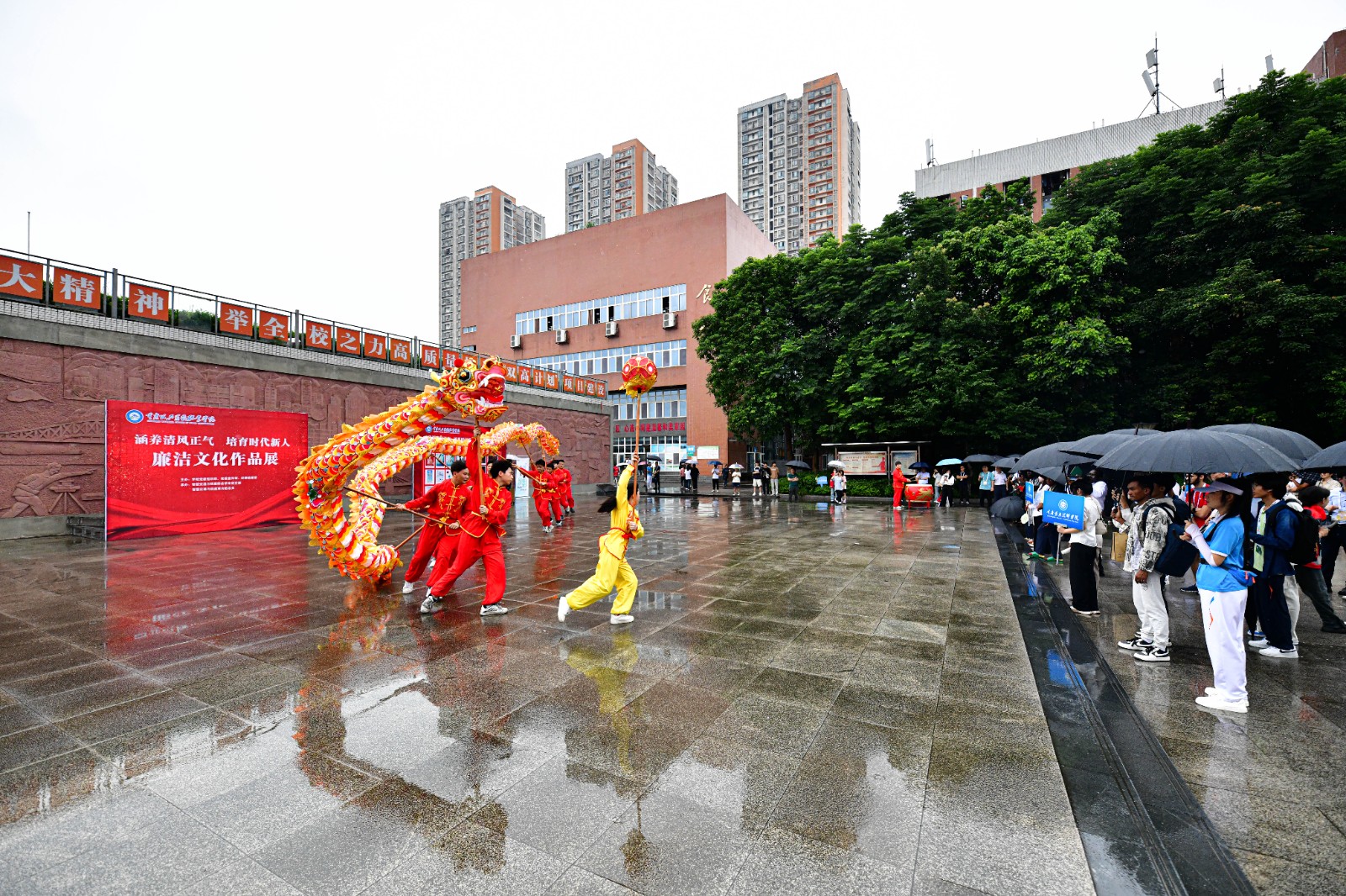 期间,组织参赛队在主校区浮雕广场等地,现场观摩交通礼仪操、传统舞龙表演和传统剪纸技艺展示。