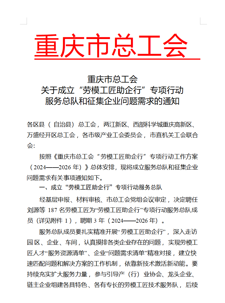 重庆市“劳模工匠助企行”专项行动于今年5月启动,计划从2024年至2026年,充分发挥我市劳模工匠在企业创新和生产经营方面的示范引领作用,通过技术帮扶、技能培训、创新攻关等帮助企业解难题、育人才、提效能,助力全市加快打造“33618”现代制造业集群体系。