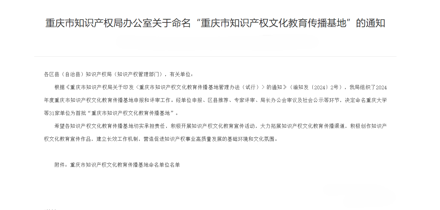 经单位申报、区县推荐、专家评审、局长办公会审议及社会公示等环节,全市共31家单位被命名为首批“重庆市知识产权文化教育传播基地”。