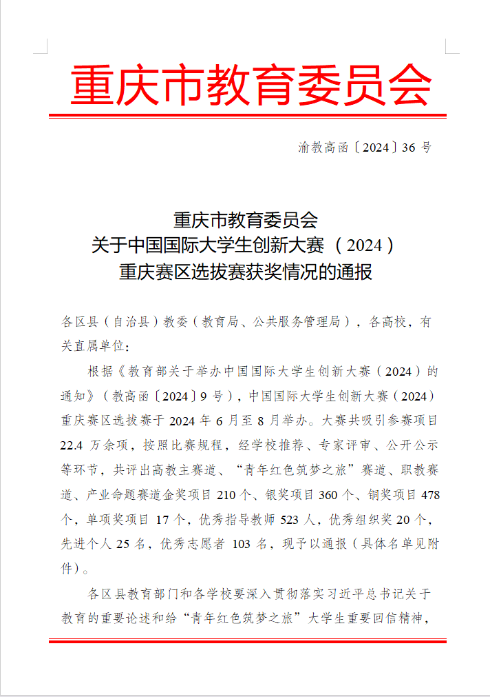 重庆市教委近日发出专门通报,公布中国国际大学生创新大赛(2024)重庆赛区选拔赛获奖名单。电子游戏喜获金奖1项、银奖4项、铜奖6项,3人获评优秀指导老师,取得历史最好成绩,学校对标一流、改革攻坚,在学生创新能力培养等方面再添新成果。