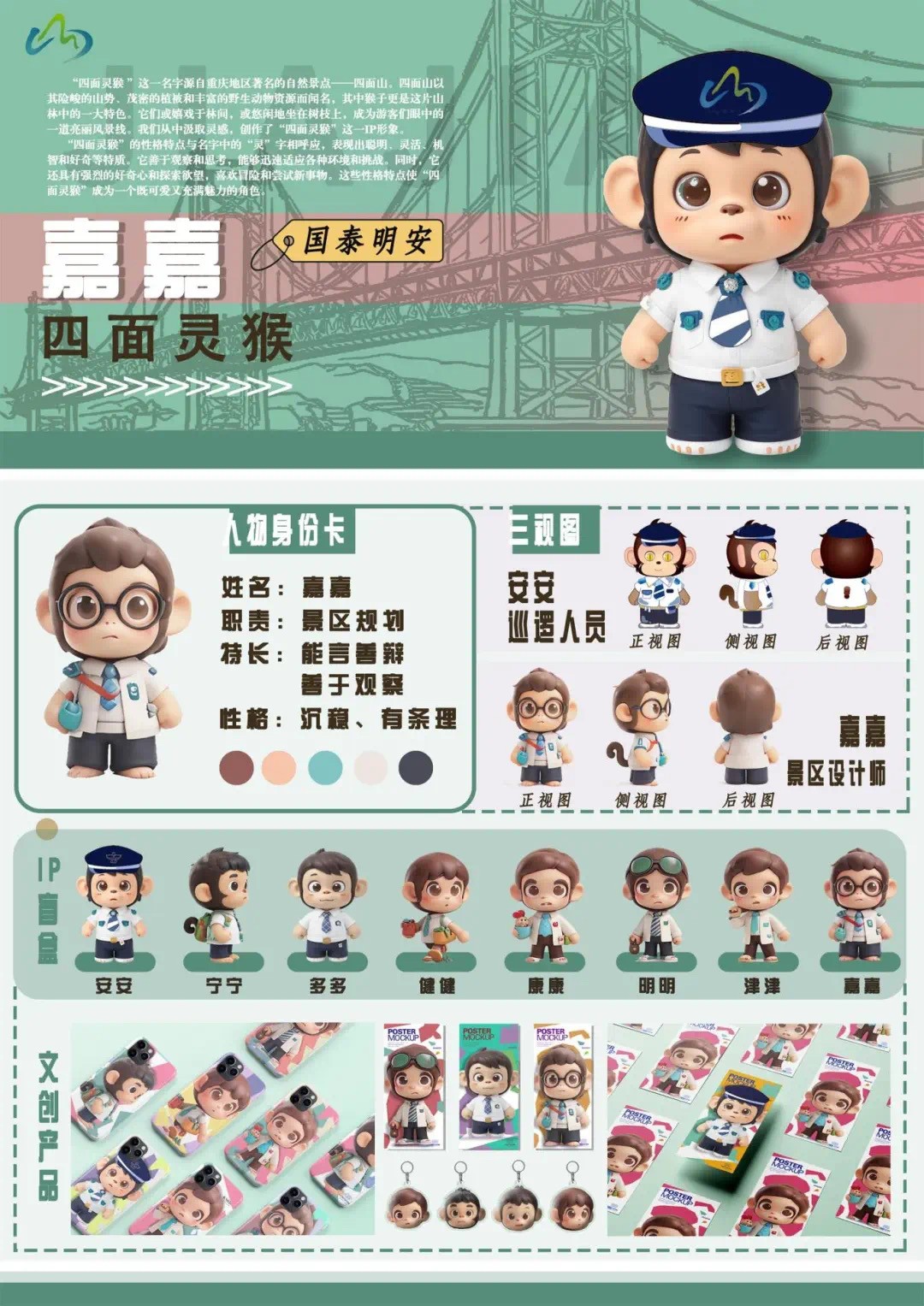 获得二等奖的是由公共管理学院沈凤玲、张洋语设计的《四面灵猴—江津四面山IP及盲盒设计》,指导老师由邱雅雄担任。作品从重庆江津四面山风景区的自然风光中汲取灵感,创作了“四面灵猴”这一动漫IP形象,创作者将 “四面灵猴”的性格特点与作品名字中的“灵”字相呼应,表现卡通形象的聪明、灵活、机智、果敢的特征。