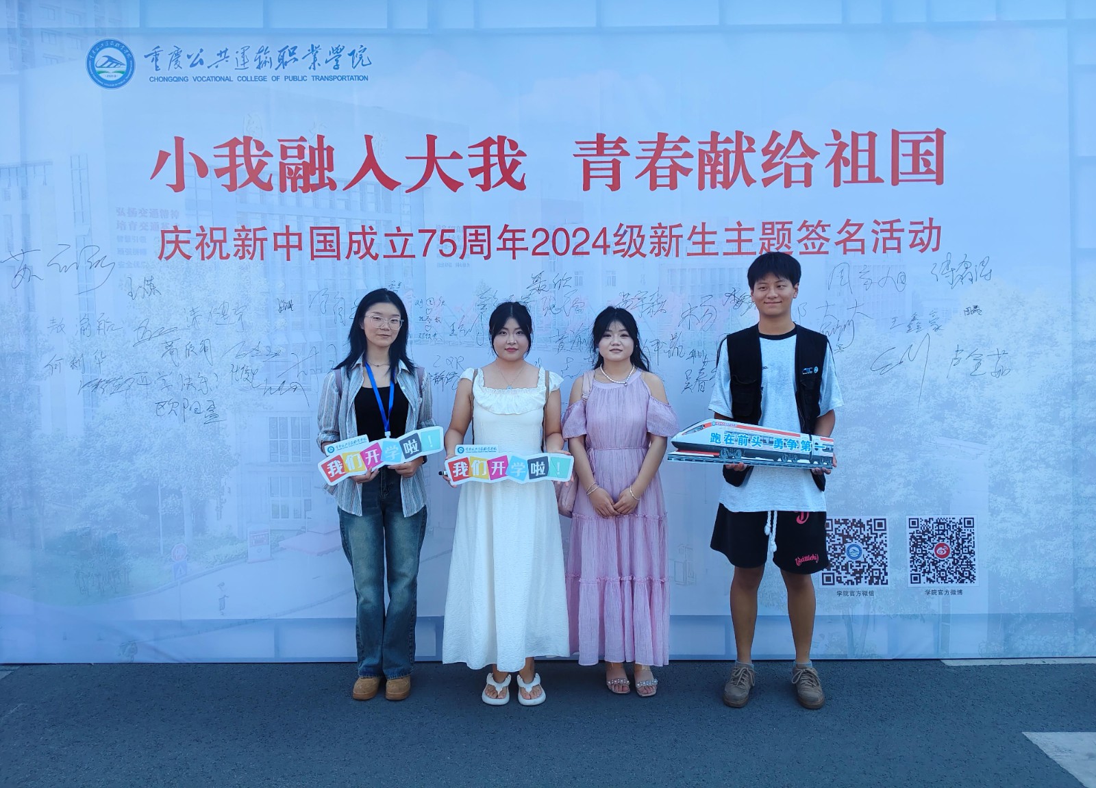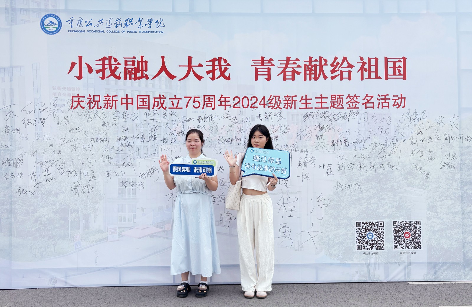 活动过程中,学校相关部门在科学城主校区、新校区2024级新生报到点关键位置,设置了两块主题签名墙,组织学生志愿者在现场邀请新生代表在家长和学长的见证下,在签名墙空白处郑重写上自己的名字,并选用“强国有我 青春有为”“乘风奔驰 未来可期”“追光而遇 沐光而行”“勇争第一 跑在前头”等反映家国情怀、交通精神和大学生活的特色元素手持牌,在主题签名墙前打卡拍照,祝福新中国成立75周年,表达“小我融入大我,青春献给祖国”的决心和信心,表达对自己大学生活的向往和期许。